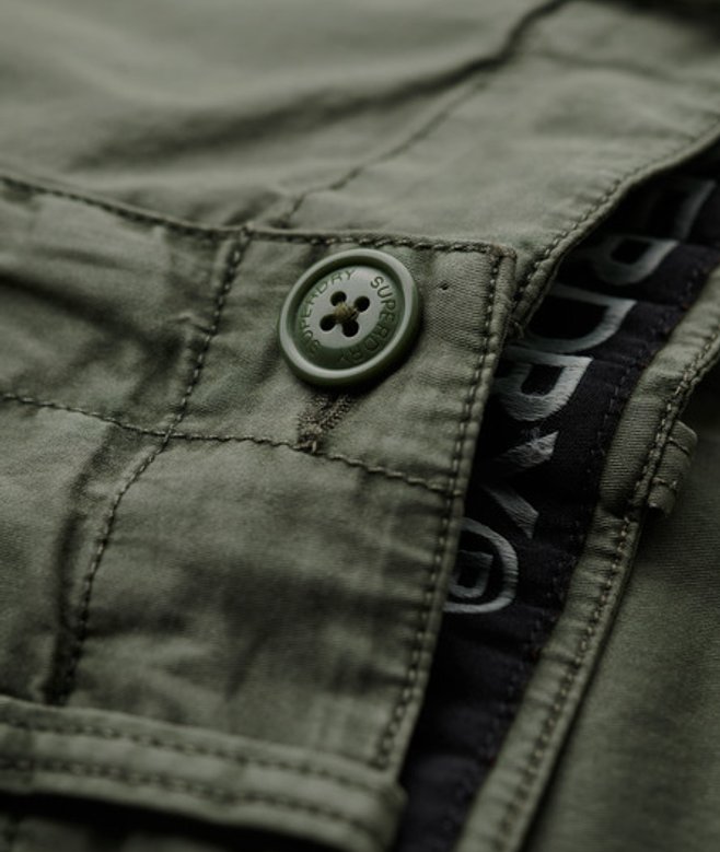 Low rise Button and zip fastening and adjustable cords Seven external pockets Cuffs with adjustable cords Signature contrast tabs on the side pocket