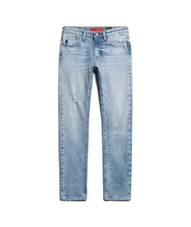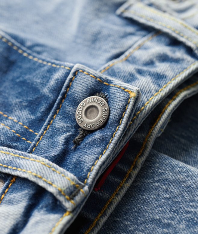 Button and zip fastening Classic five-pocket design Washed effect Superdry patch