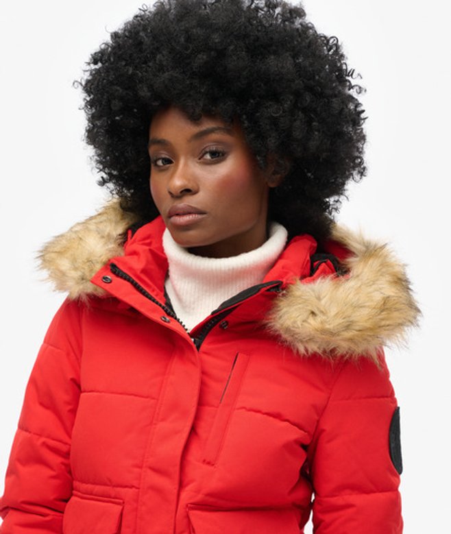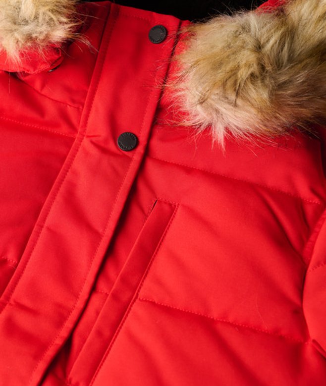 Zip and popper fastening Faux fur trim Detachable hood Elasticated hem and cuffs Hood fleece lining 3 pocket design Bungee cord adjustable hood Signature Superdry badge The padding in this jacket is 100% Recycled Polyester - each jacket contains up to 10 recycled bottles, this avoids these bottles being sent to landfill or polluting our oceans.