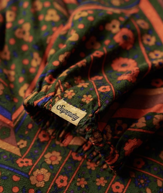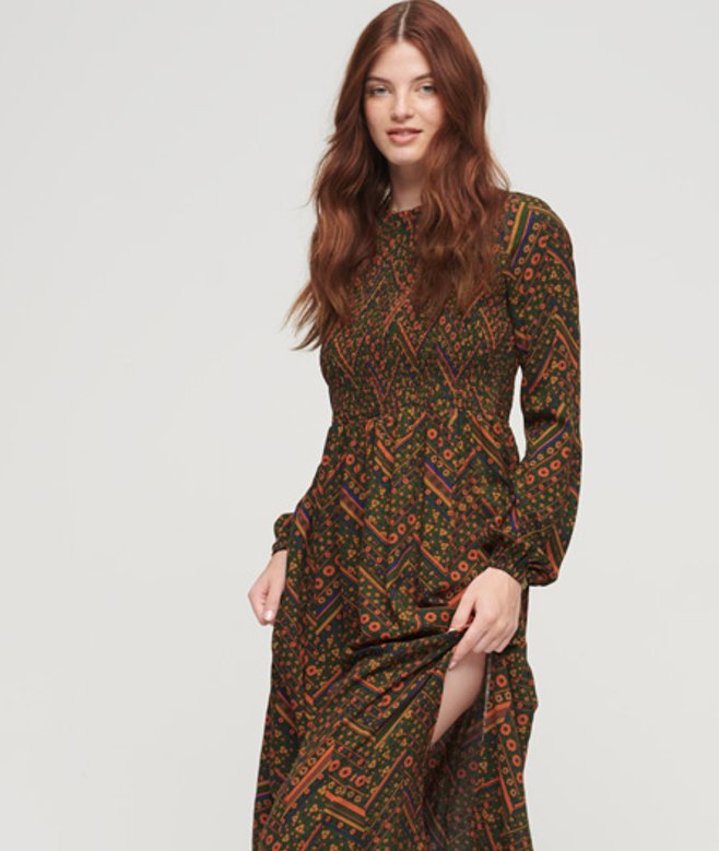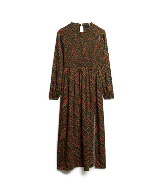 Slim fit - designed to fit closer to the body for a more tailored look Ankle-length midi design All-over floral print Ruffled collar Smocked and elasticated body Long sleeves Flowing skirt design Elasticated cuffs Rear button fastening with keyhole design Subtle cuff logo tab