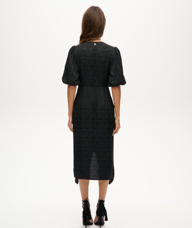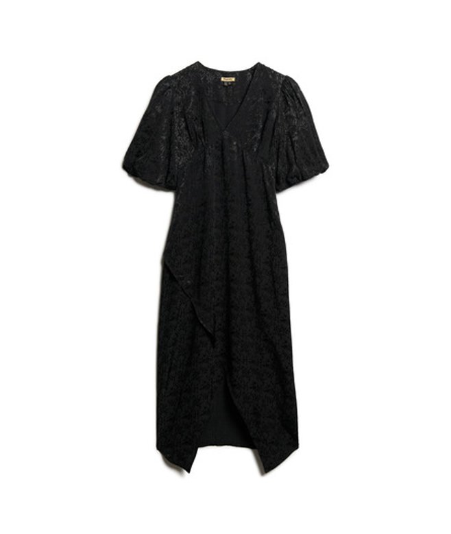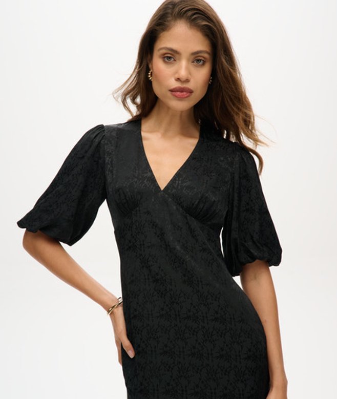 Crafted with a flattering V-neck and fitted waistline, it's the perfect dress for showing off your style whilst looking and feeling great. Slim fit - designed to fit closer to the body for a more tailored look UK10 shoulder to hem: 118cm Jacquard fabric V-neckline Short, slightly puffed sleeves with elasticated cuffs Tulip wrap skirt Side zip fastening