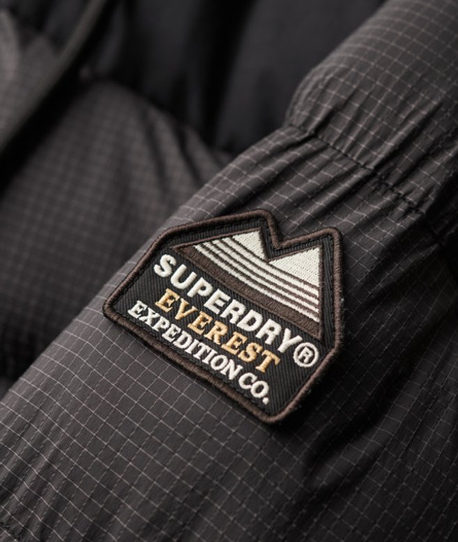 Go for your normal size UK10 shoulder to hem: 115cm Padded hood with adjustable drawcords Padded throughout Zip through with popper fastening Football grid stitched-in pattern Two external pockets One internal pocket Adjustable popper side seam Inside sleeve with thumb hole Crafted from recycled materials Bright contrast Superdry rubber tag on the sleeve Embroidered Superdry text on the back