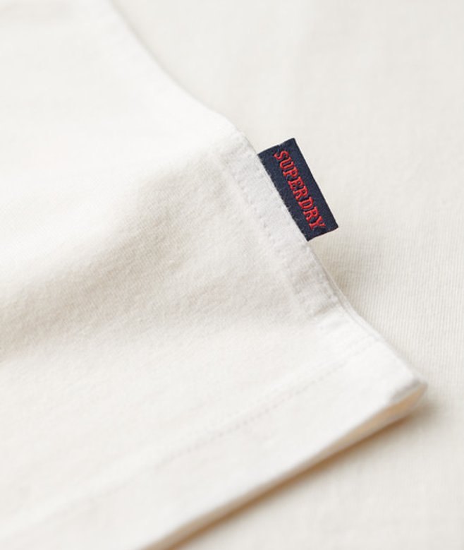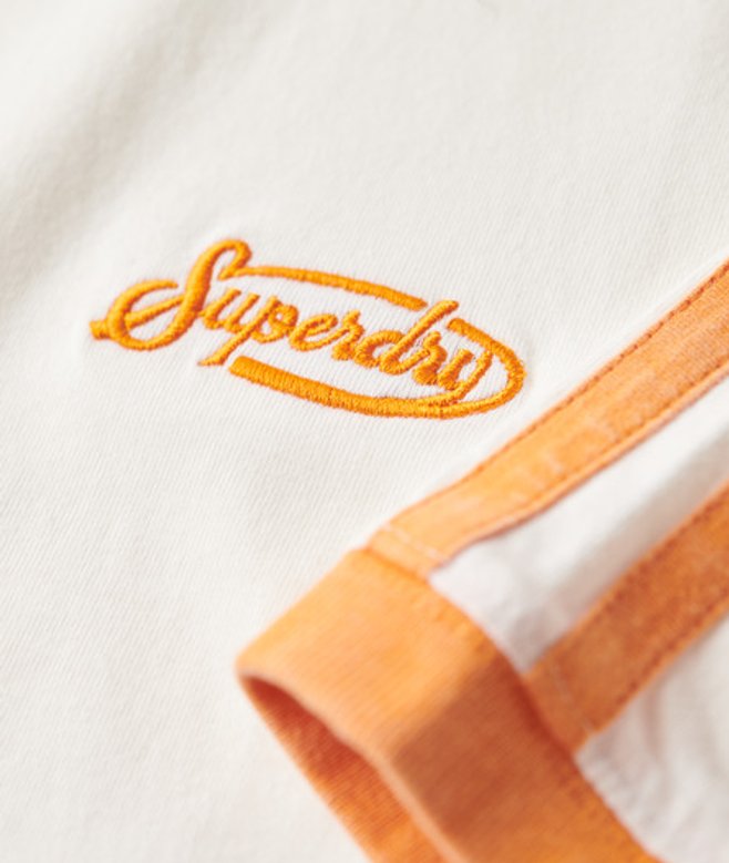 Go for your normal size Ribbed crew neckline and short sleeves with contrasting trim Contrasting stripes down the sleeves and an embroidered text on the chest Signature tab on the side seam A vintage twist on the much-loved classic tee.