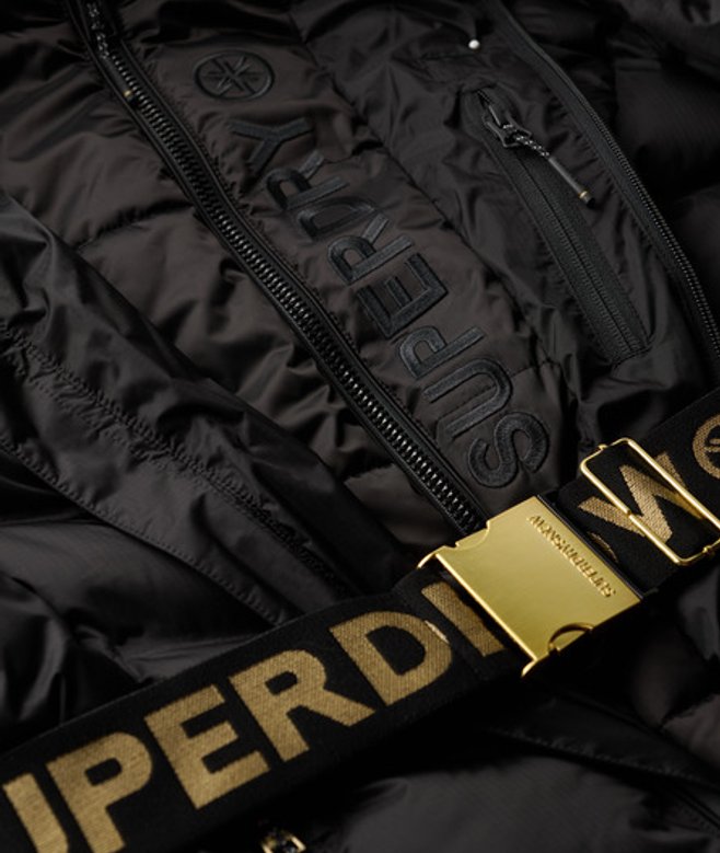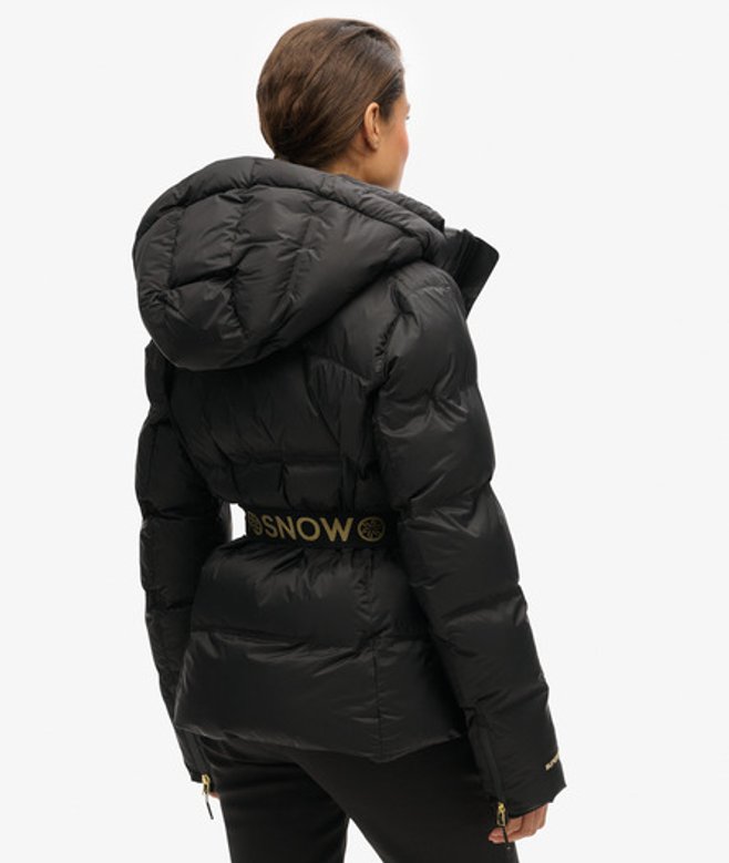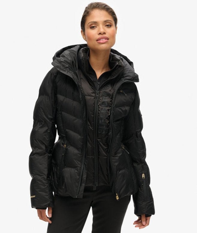 Slim fit - designed to fit closer to the body for a more tailored look Breathable 10k/mm - Provides airflow comfort for low to mid-level activity Waterproof 10k/mm - Rainproof and waterproof under light pressure, for light rainy days Breathable fabric - Allows air and moisture to pass through the material to help keep you comfortable Fully taped seams - Seams have been internally taped to help prevent water penetration Durable water repellency - This fabric has been coated with an advanced water-resistant finish Removable snow skirt Flattering adjustable belt around the waist Removable hood Helmet-compatible hood Bungee cord adjustable drawstrings on the hood Lightly brushed lined collar Storm cuffs with thumb hole Double-layered zip Lift pass holder on the sleeve Three external pockets One internal pocket Embroidered Superdry text along the zip layer Contrast stitched Superdry text on the sleeve Embroidered Superdry logo on the side of the sleeve