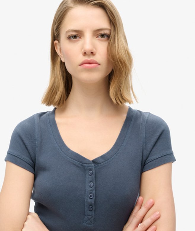 Looking for your newest go-to? When it comes to essentials, we never drop the ball on quality and comfort: made from organic cotton for a super soft feel and crafted in a flattering slim fit design, the Essential Button Down Short Sleeve Top is the ideal top for whatever you need. Slim fit - designed to fit closer to the body for a more tailored look Ribbed fabric Crew neck Cap sleeves Button detailing on the front Embroidered Superdry text and the bottom