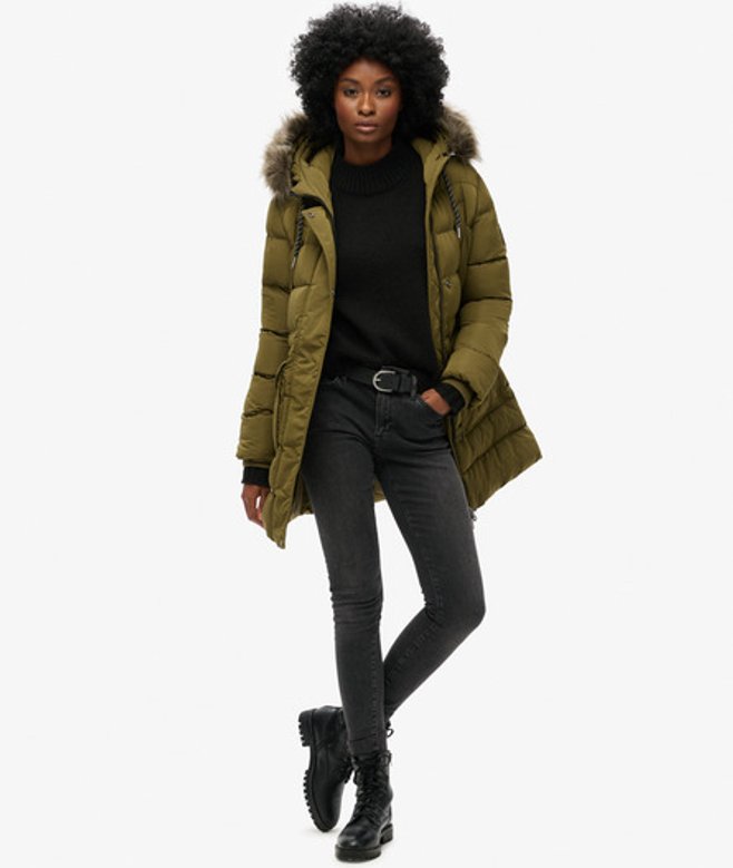Superdry Women's Classic Everest Mid Faux Fur Puffer Coat, Green