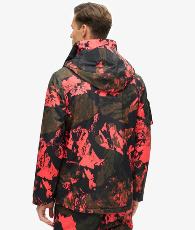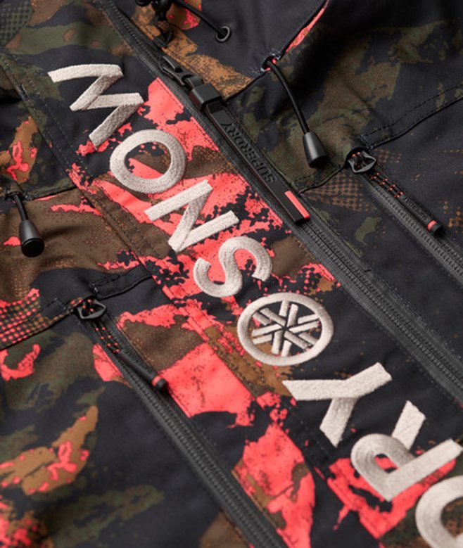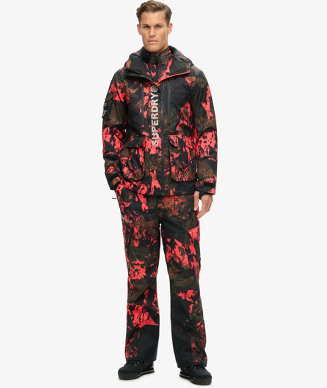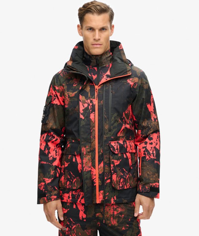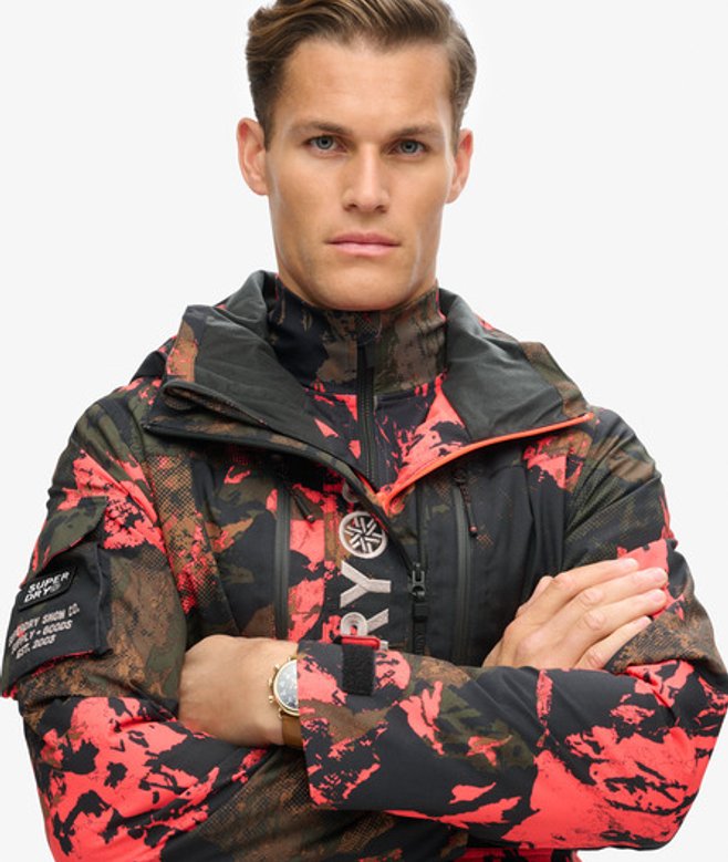 With multiple pockets, we have crafted it to allow you to keep everything you need on you whilst you're spending the day on the slopes. Loose Fit - where comfort meets cool, a stylish loose cut makes this a must-have shape Breathable 20k/MM - Provides airflow comfort for very high-level activity Waterproof 20k/MM - Waterproof under high pressure, for heavy rain and wet snow Fully taped seams - Seams have been internally taped to help prevent water penetration Helmet-compatible hood with stiffened peak and bungee cord adjusters Pit zips Lift pass ticket holder Four external pockets One internal pocket Double layered zip Removable snow skirt Fully padded throughout Bungee cord adjustable hood and hemline Hook & loop adjustable cuffs Cuffs with thumb hole Contrast zips Superdry metallic text embroidered onto the side arm Superdry contrast stitching at the bottom and on the back
