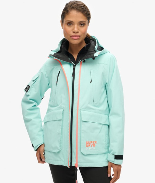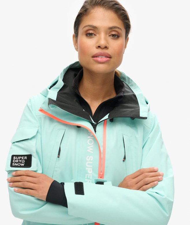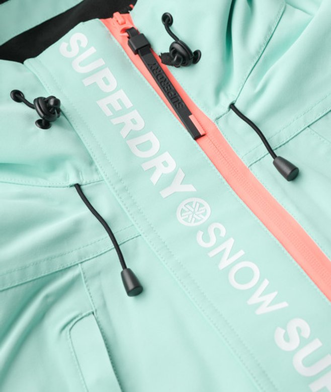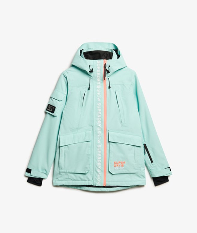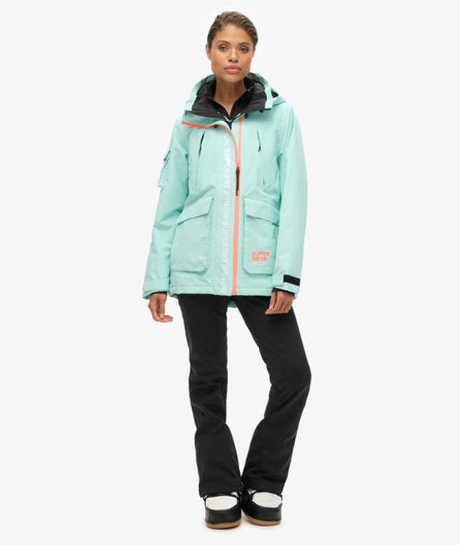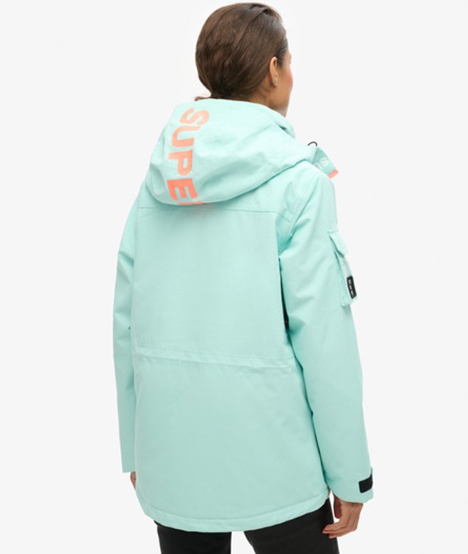 Loose Fit - where comfort meets cool, a stylish loose cut makes this a must-have shape Durable water repellency - This fabric has been coated with an advanced water-resistant finish Waterproof 20k/mm - Waterproof under high pressure, for heavy rain and wet snow Removable snow skirt Bungee cord adjustable hood and waistline Four external pockets One internal pocket Ticket holder on the sleeve Cuff with thumb hole Contrast printed Superdry text on the sleeve Contrast Superdry stitching across the body