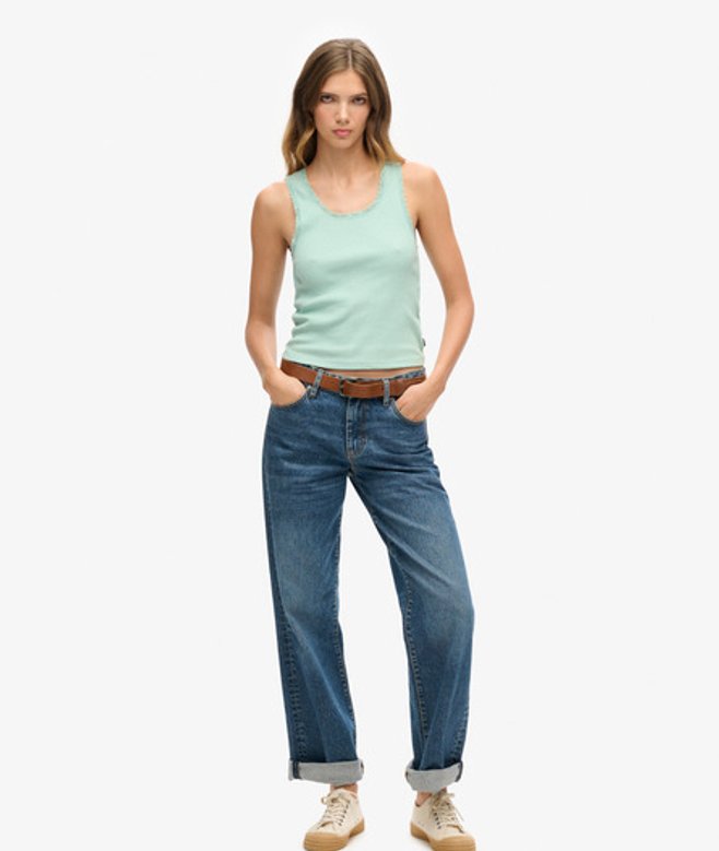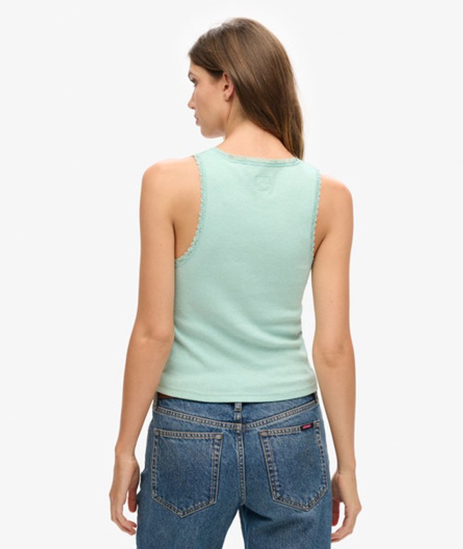 Slim fit - designed to fit closer to the body for a more tailored look Ribbed material Lace trim Sleeveless Scoop neck Superdry tab