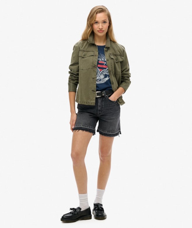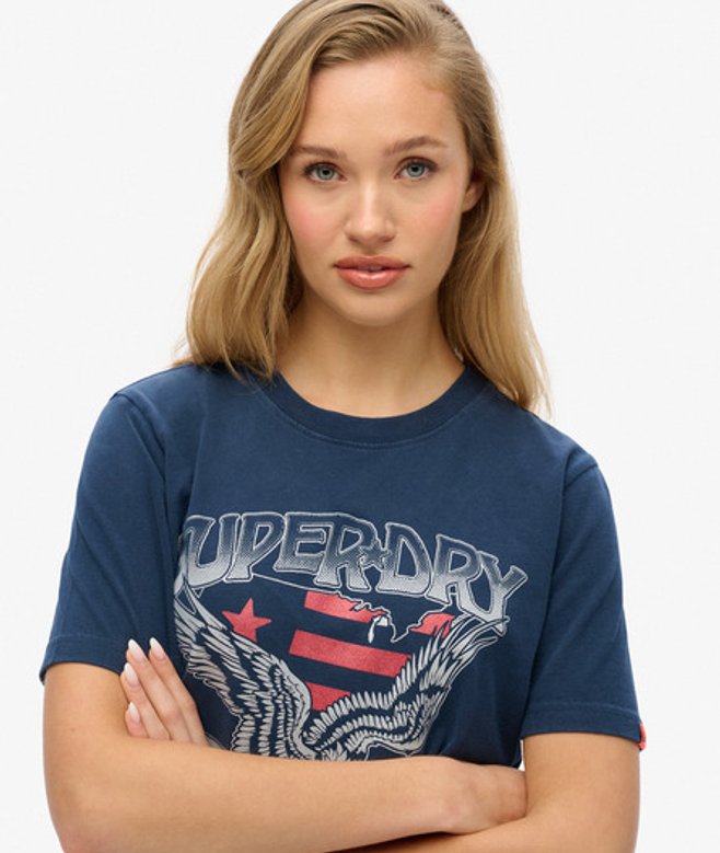 Go for your normal size Ribbed crew neckline with a signature tab on the sleeve Large embellished graphic on the front A reworked Superdry classic, our Embellished Varsity Relaxed T-Shirt has been crafted with a fresh, fun graphic across the front.