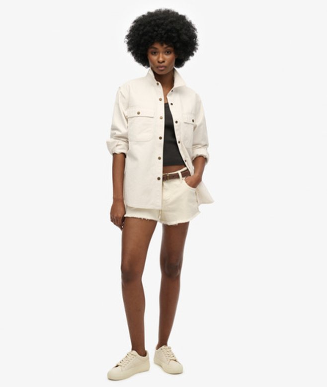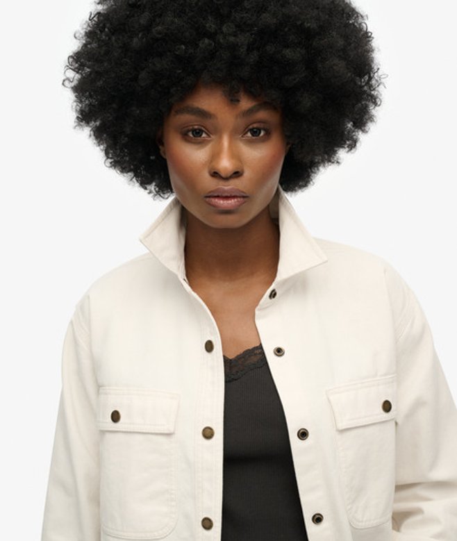 Oversized fit - exaggerated and super relaxed, let your style flow Woven material with dropped shoulders and button fastening Two external pockets with button detailing and fastening UK 10 Length: 76cm The ideal layer for the mild weather, our Workwear Overshirt is the perfect addition to any wardrobe.