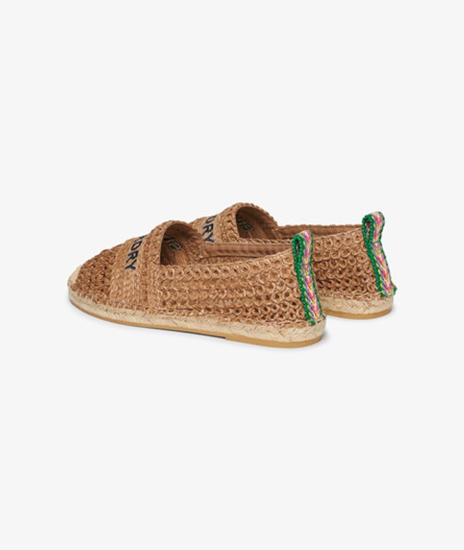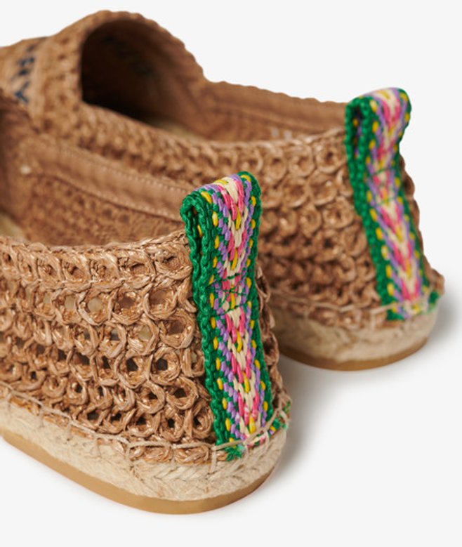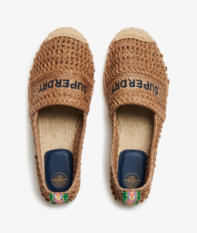 Classic espadrille design with crochet material Embroidered text across the front Woven pull tabs on the back Espadrilles are a classic for summer and we've taken the much-loved style and elevated it with raffia fabric and statement text to create a stunning wardrobe essential that you simply won't want to put away.