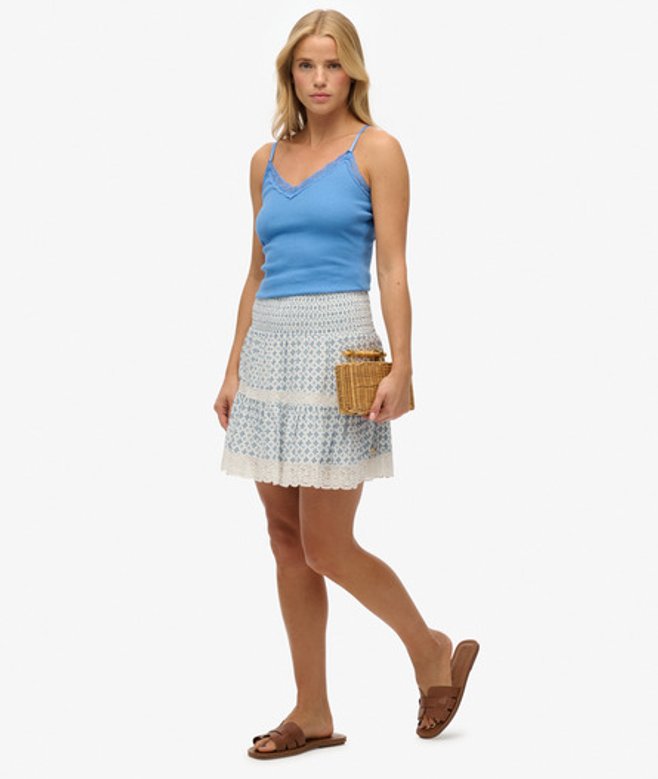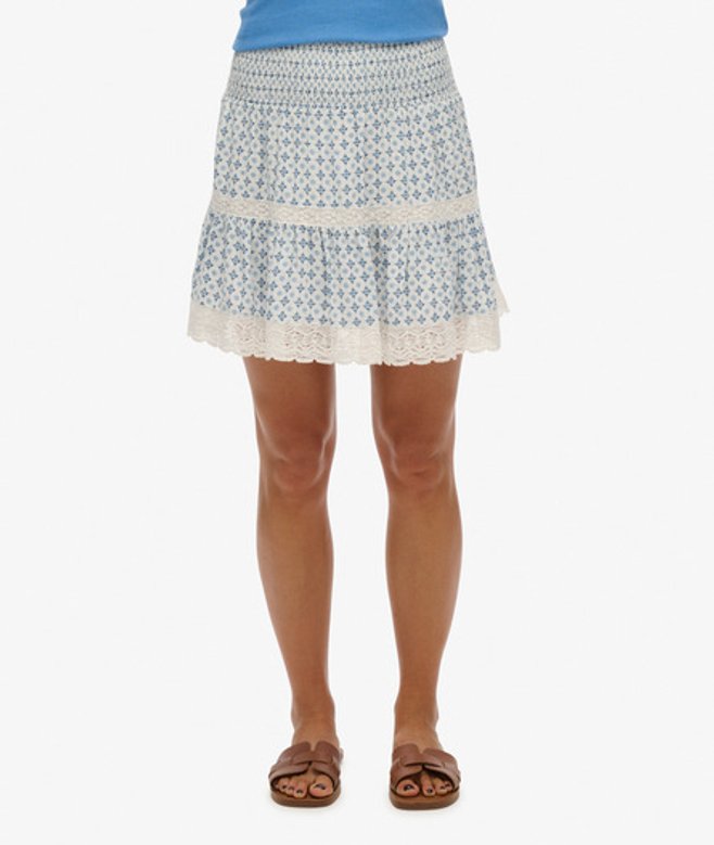 Go for your normal size Smocked waistband Tiered skirt Mini length Superdry metal badge The Printed Lace Trim Mini Skirt is a timeless summer staple that brings you a delicate vintage aesthetic to add to your sunny day wardrobe.