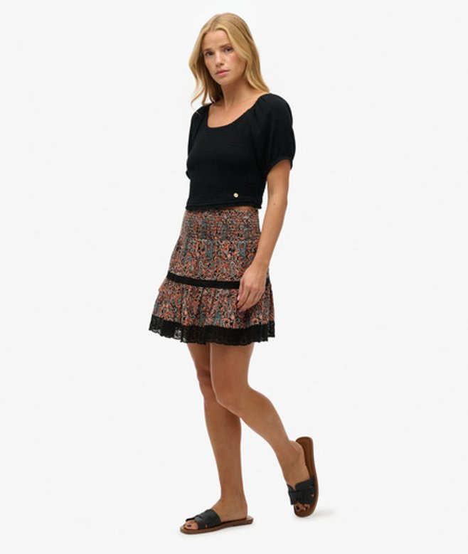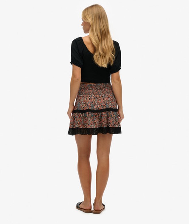 Go for your normal size Smocked waistband Tiered skirt Mini length Superdry metal badge The Printed Lace Trim Mini Skirt is a timeless summer staple that brings you a delicate vintage aesthetic to add to your sunny day wardrobe.