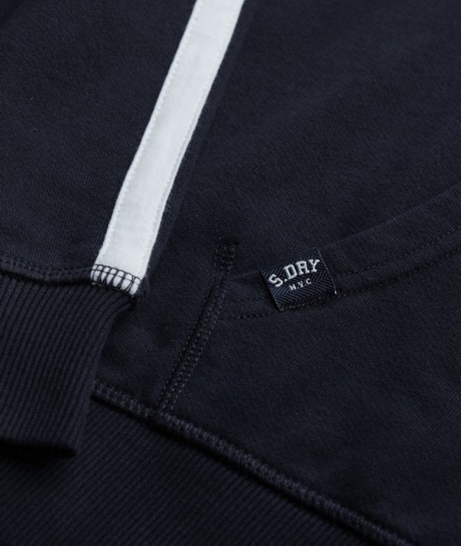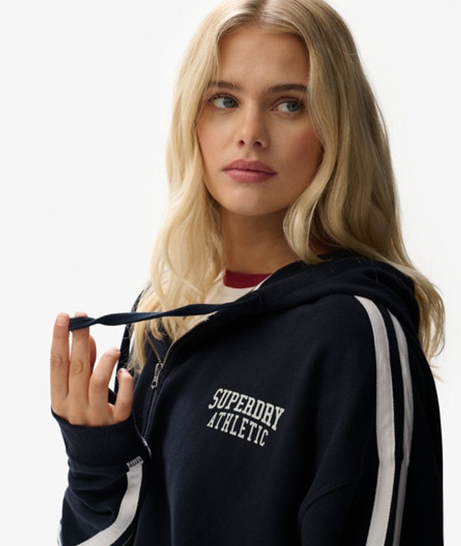 Go for your normal size Ribbed cuffs and hem Textured inner hood Zip fastening Two front pockets Printed Superdry Athletic logo on chest Superdry Athletic tab on edge of right pocket Our Athletic Essentials range echoes a more casual version of Americana sport stylings.