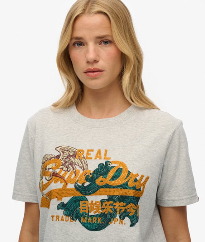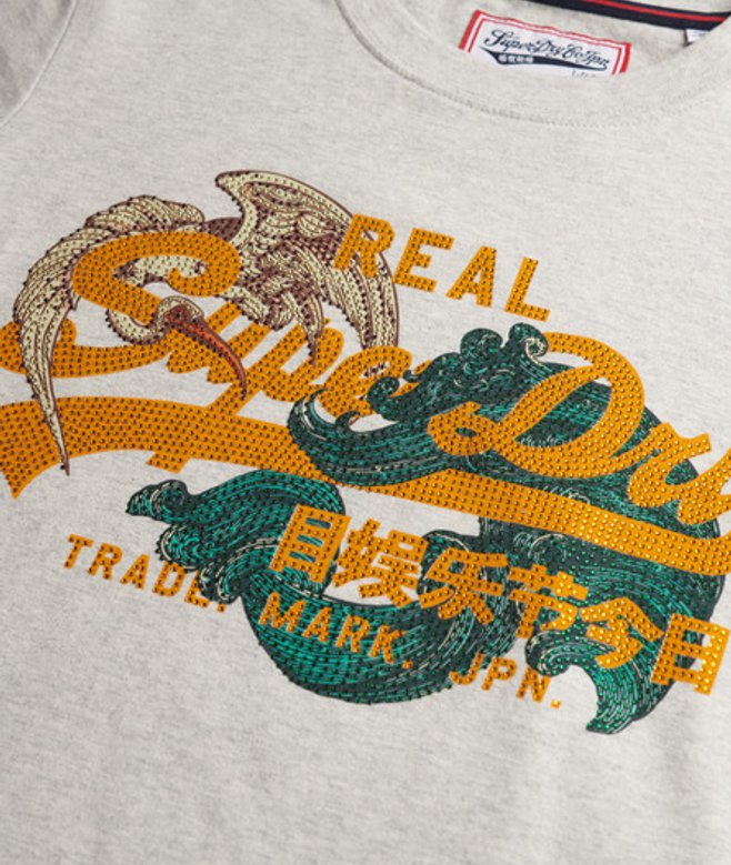 Go for your normal size Ribbed crew neckline with a signature tab on the sleeve Diamonte graphic logo on the chest A Superdry classic that we've elevated, and tailored to your authentic style.