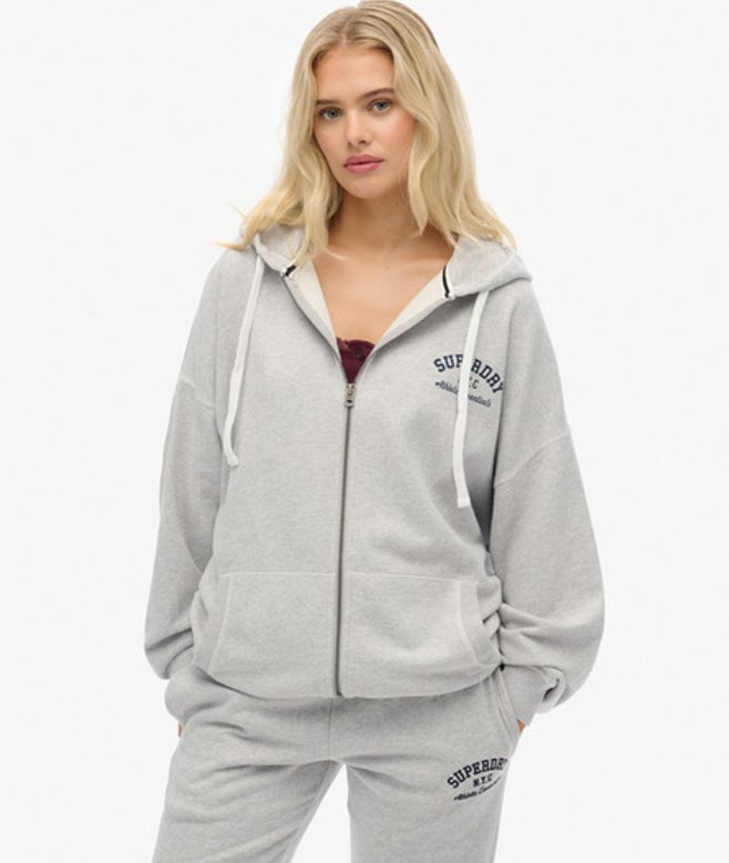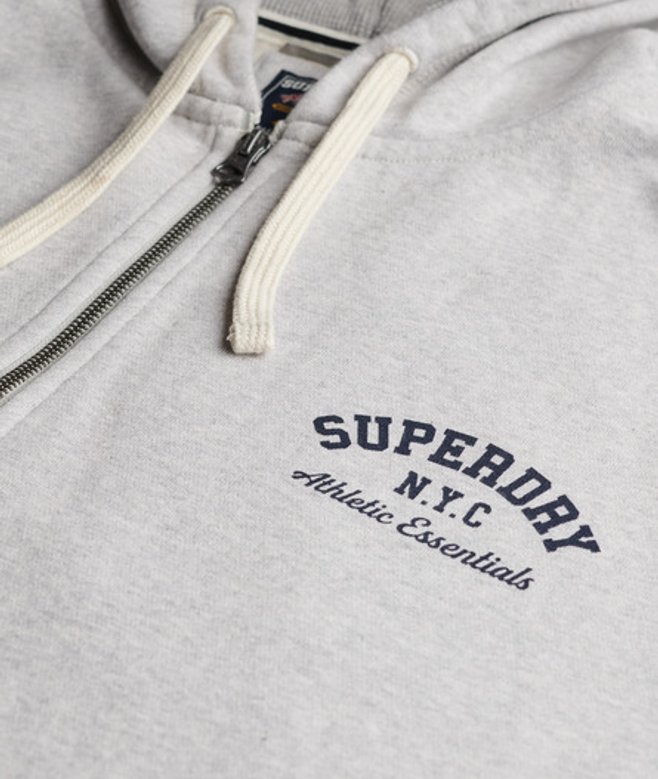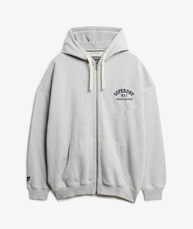 Oversized fit - exaggerated and super relaxed, let your style flow Ribbed cuffs and hem Zip fastening Textured inner hood Two front pockets Printed Superdry Athletic logo on chest Small embroidered logo below right cuff Our Athletic Essentials Oversized Zip Hoodie is an absolute staple of collegiate outerwear fashion, and continues to elevate with its new premium feel.