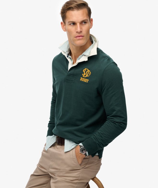 Go for your normal size Rugby collar with three-button fastening Long sleeves Ribbed cuffs Split side hem Embroidered Superdry logo Signature Superdry patch The Vintage Athletic Jersey Rugby Top is an iconic piece that calls back to both British sport and American adaptation.