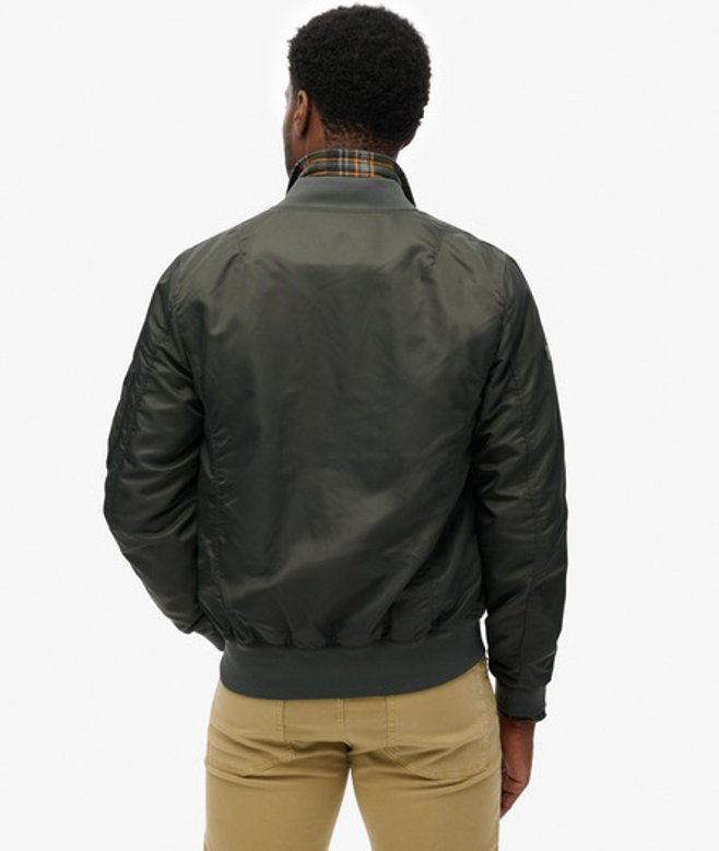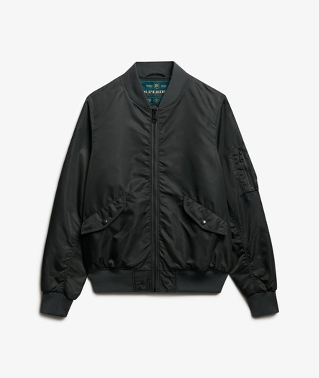 Go for your normal size Standard collar with ribbed trims and zip fastening Three external pockets with one internal pocket Signature branding on the sleeve A Superdry classic, the Merchant MA 1 Bomber Jacket combines the best elements of vintage and American style.