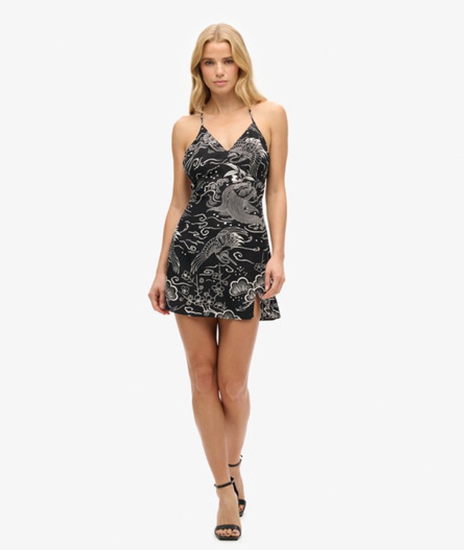 Schmale Passform - enger geschnitten für einen figurbetonten Look Nackenträger mit V-Ausschnitt Versteckter Seitenreißverschluss Kleiner Seitenschlitz Verstellbare Spaghettiträger Superdry Aufnäher