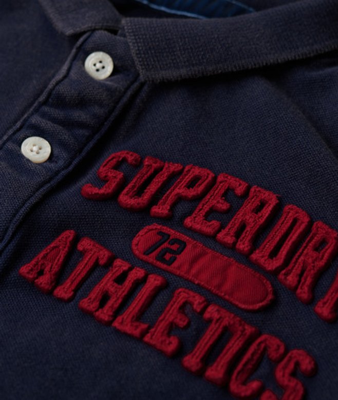 Wähle deine normale Größe Knopfleiste mit zwei Knöpfen Gerippte Abschlüsse an den Ärmeln Seitliche Schlitze Gesticktes Superdry Logo Charakteristisches Superdry Etikett am Ärmel Eine rote Filzapplikation mit dem Schriftzug „Superdry 72 Athletics"