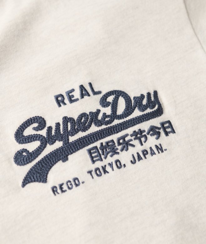 Wähle deine normale Größe Rundhalsausschnitt und kurze Ärmel Logostickerei auf der Brust und Etikett am Ärmel Unser klassisches Vintage-T-Shirt mit Logoprint verkörpert den Stil und Charme eines charakteristischen Superdry Kleidungsstücks.