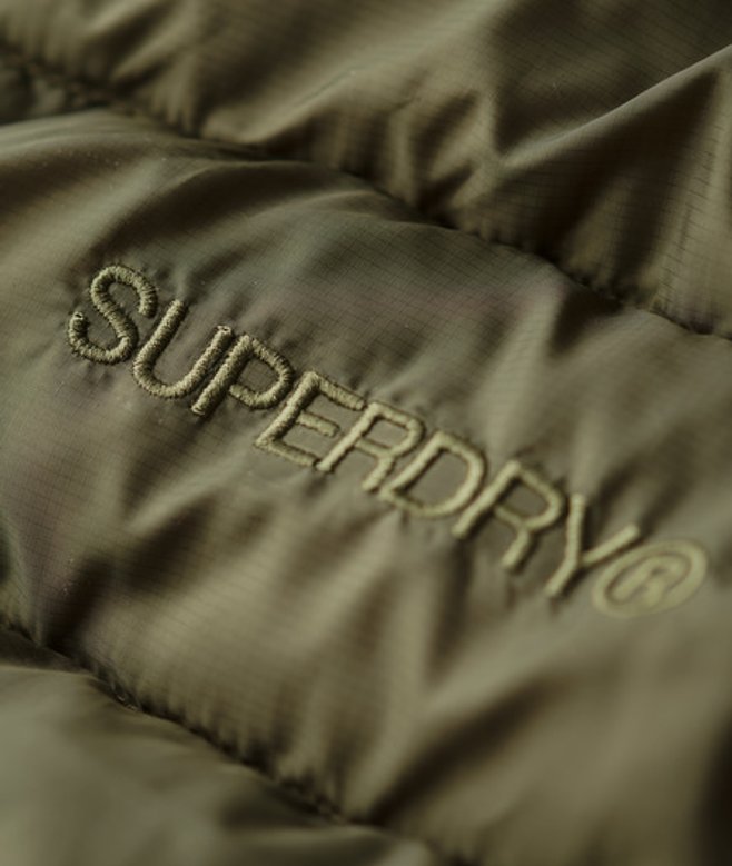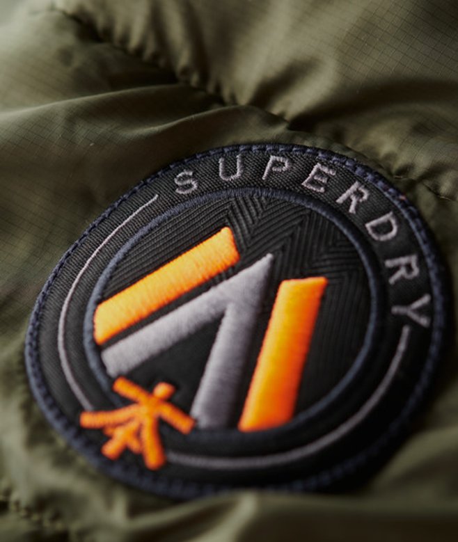 Kapuze mit verstellbarem Kordelzug Zwei Reißverschlusstaschen auf der Vorderseite Innentasche Verstellbare Druckknöpfe an den Bündchen Durchgehend leichte Wattierung Lang geschnitten „Fuji series" auf den rechten Ärmel genäht Superdry Logo auf Ärmel und Rückseite des Mantels