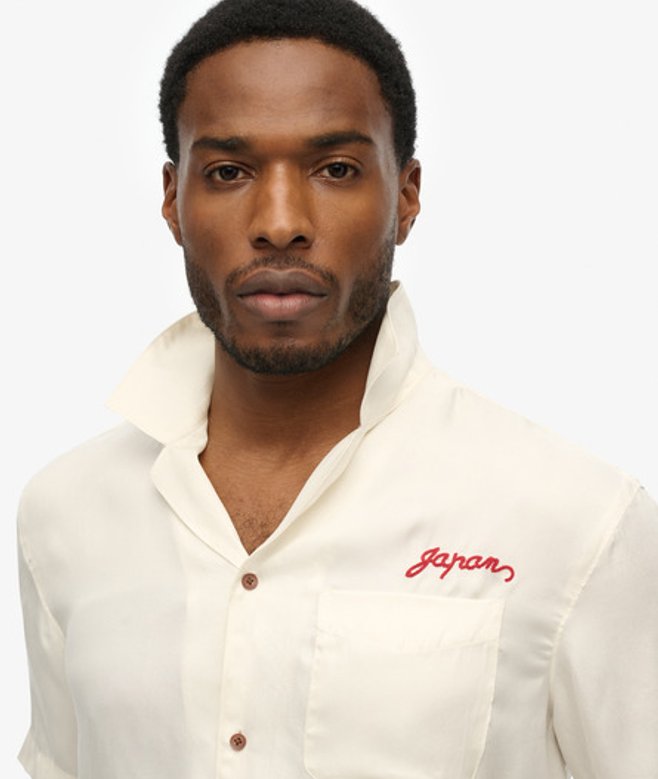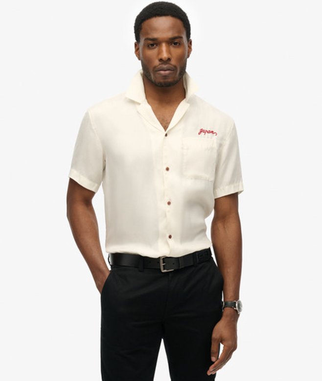 Wähle deine normale Größe Einfacher Kragen und kurze Ärmel Button-Down-Design mit einer Brusttasche Große Stickgrafik auf der Rückseite Charakteristische Textstickerei über der Tasche Präsentiere dich in dieser Saison stolz in unserem Merchant Suika Hemd.