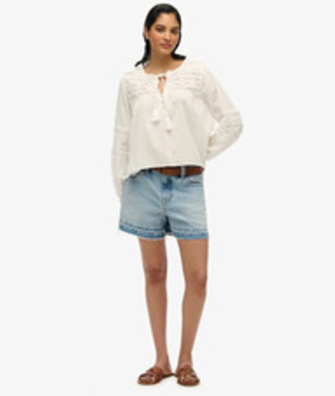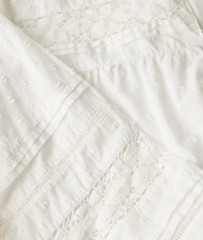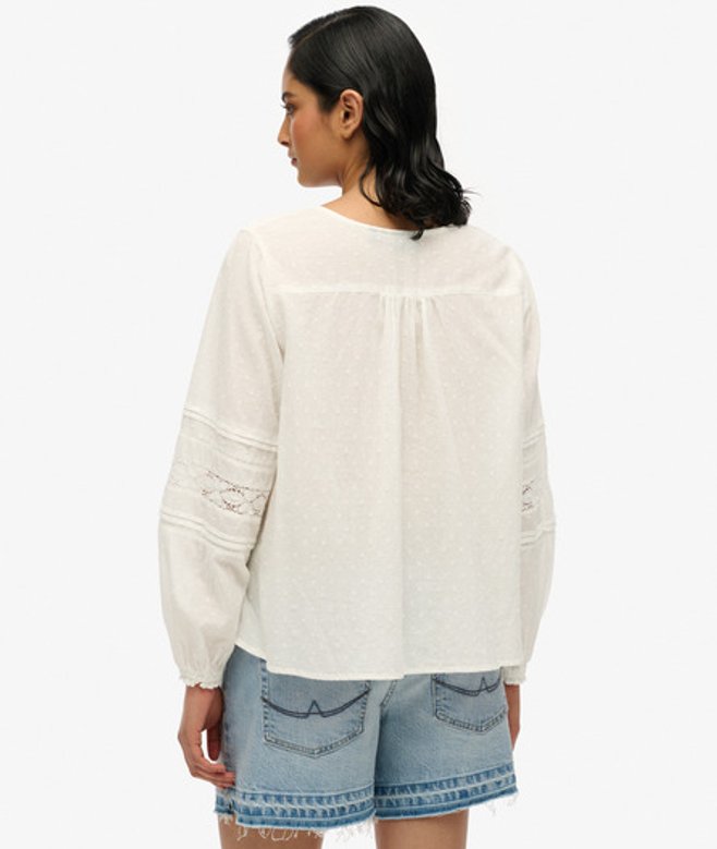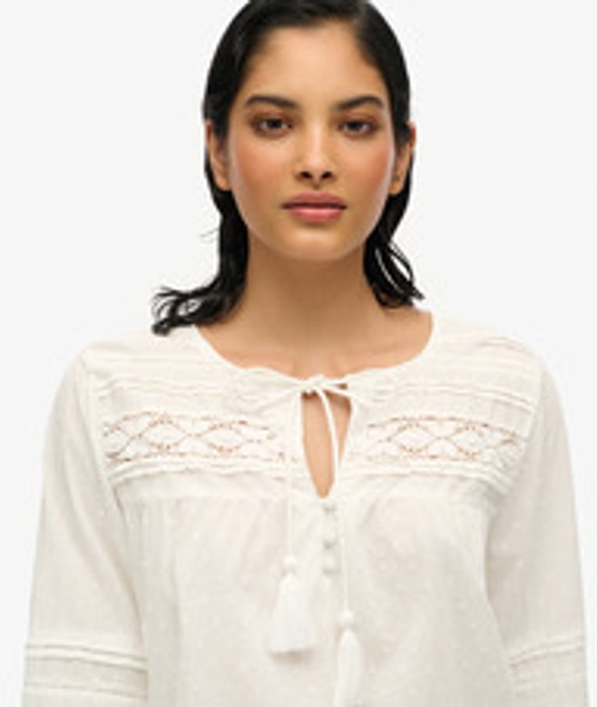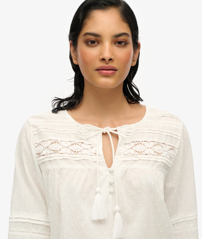 Unsere Ibiza Spitzenbluse wurde mit einem Cutout-Ausschnitt und Spitzendetails an der gesamten Bluse gefertigt.