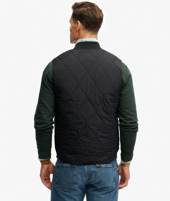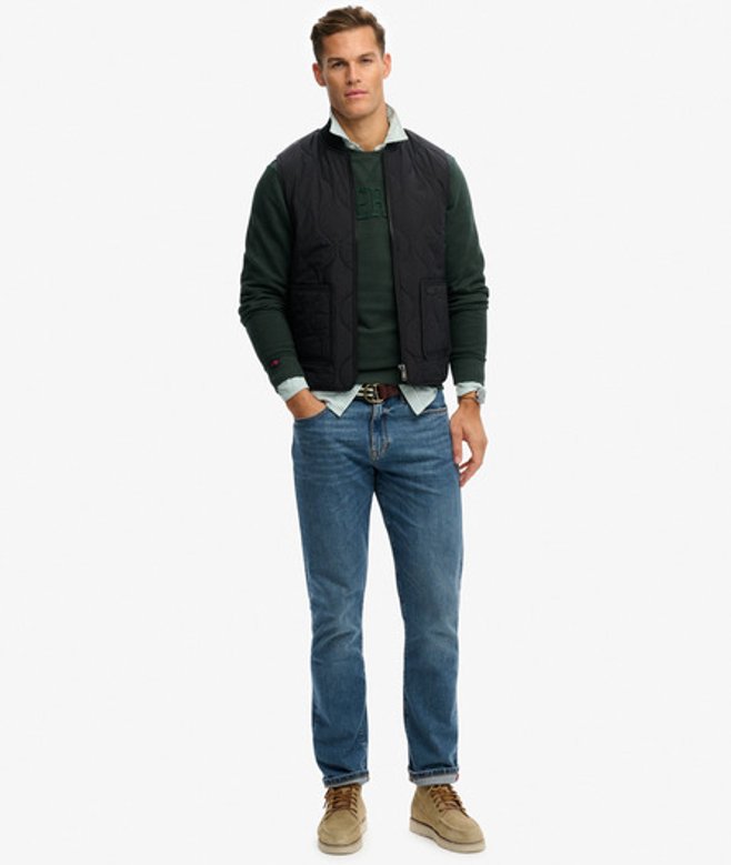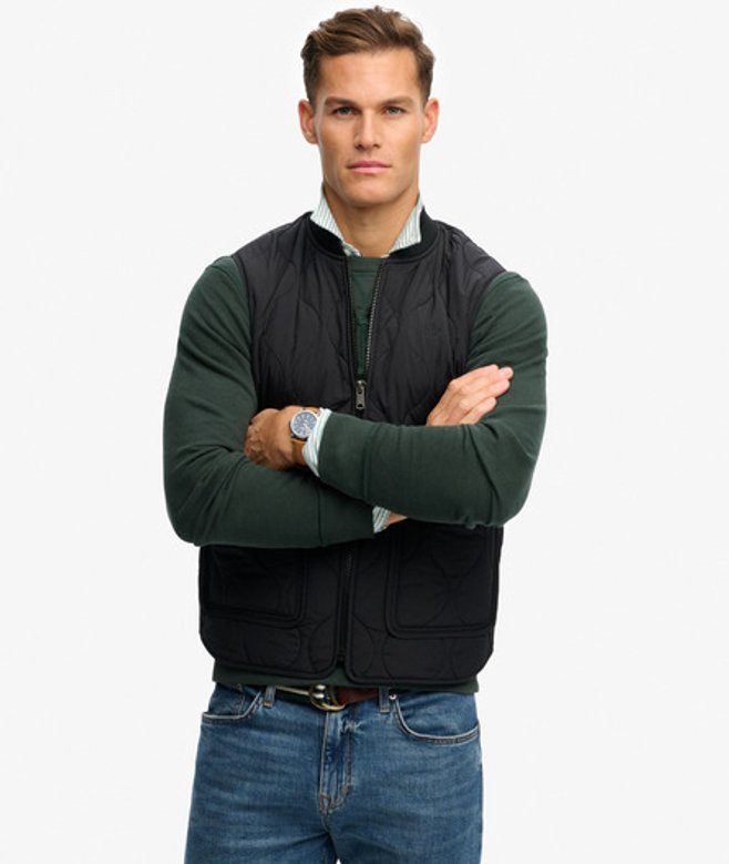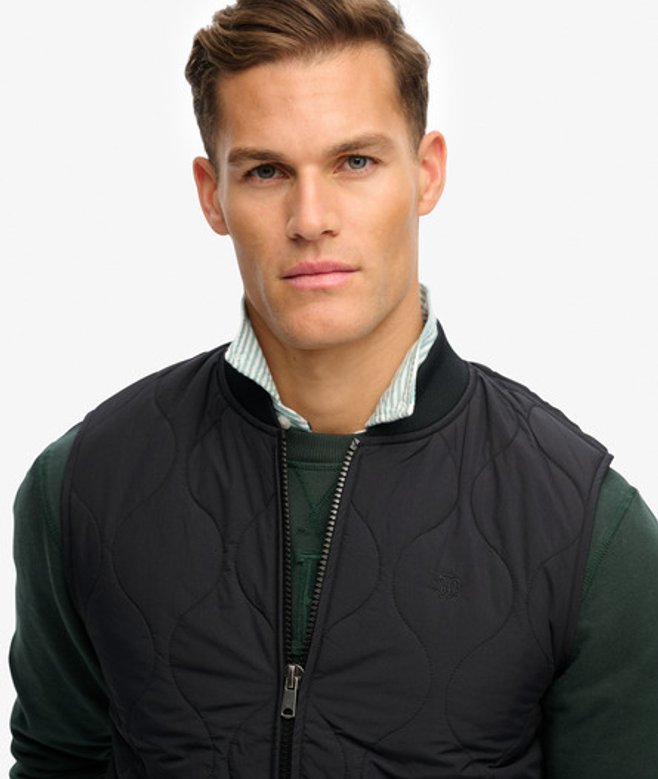 Wähle deine normale Größe Klassisches Kragendesign mit geripptem, elastischem Material Leicht wattiert mit durchgehendem Reißverschluss Zwei Außentaschen mit charakteristischem Label Vollständig gefüttert Minimales SD & CO Logo auf der Brust Minimalistisch und vielseitig - die Military Liner Weste ist deine ideale Schicht für Übergangswetter.