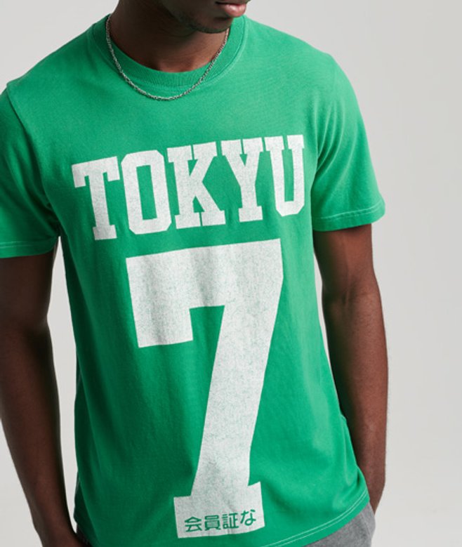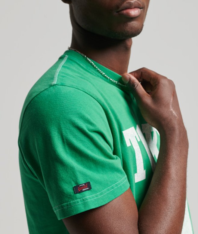 Der klassische Distressed-Print auf dem leuchtend grünen T-Shirt sorgt für einen starken Look.
