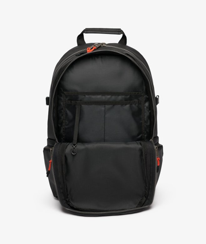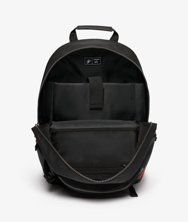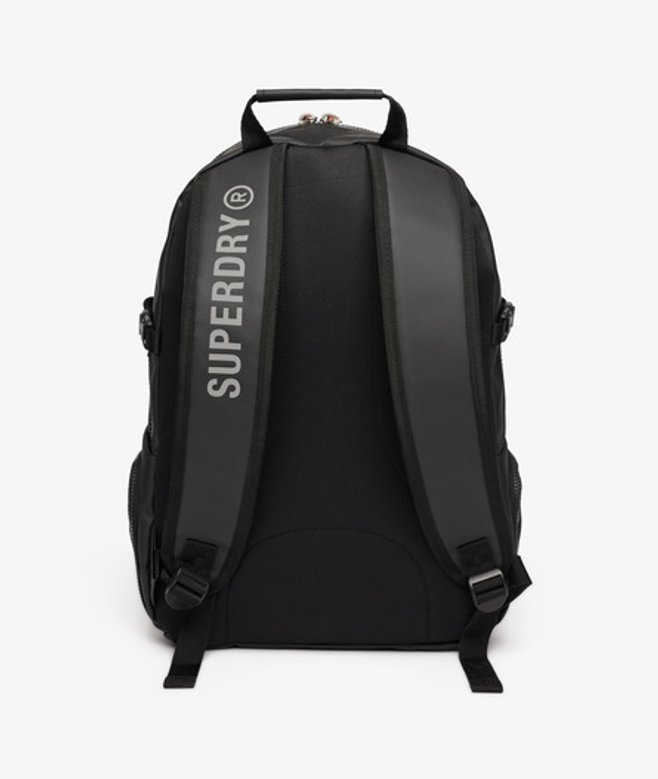 Compagnon ultime pour tous les types d'aventures, ce sac à dos est prêt à tout et toi? Poignée sur le dessus Compartiment principal zippé avec pochette rembourrée intégrée pour ordinateur portable Poche de rangement intégrée en maille filet zippée Compartiment secondaire zippé avec poches de rangement intégrées Poche zippée sur le devant Poches latérales zippées Bretelles réglables rembourrées et ventilées Empiècement dorsal matelassé et ventilé Base renforcée Logo Superdry brodé sur le devant H 46 cm x L 33 cm x P 14 cm