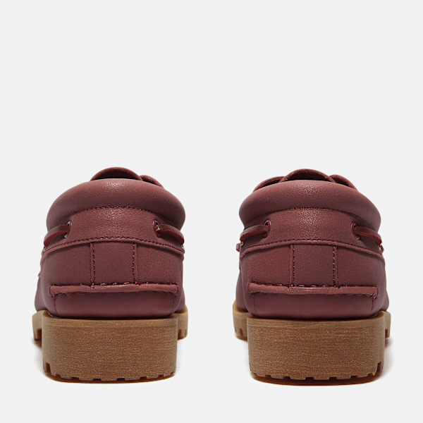 De schoen van handgenaaid Premium Timberland® Leather in een diep bordeauxrood heeft een glanzend, reflecterend bovenwerk en een HS-label met merklogo.