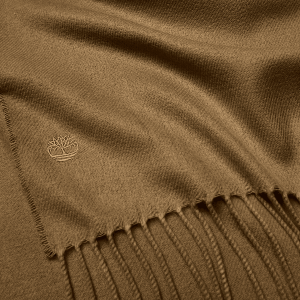 Made with 100% acrylic this scarf has a raw edge with a twisted fringe and an embroidered Timberland Tree logo