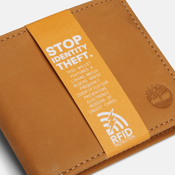It features RFID-blocking recycled PET lining, embossed Timberland branding, an ID window with thumb ejector, card slots, and a currency pocket