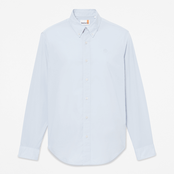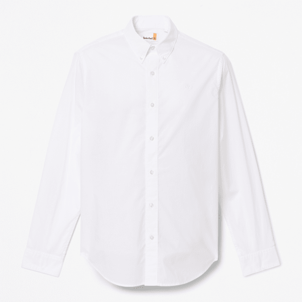 Made from 100% cotton with natural stretch, it features a button-down collar, embroidered Timberland tree logo, and a regular fit