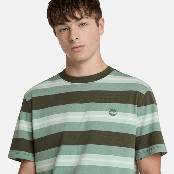 Descubre esta camiseta de manga corta a rayas para hombre en 100 % algodón orgánico, procedente de explotaciones agrarias que no utilizan semillas modificadas genéticamente.