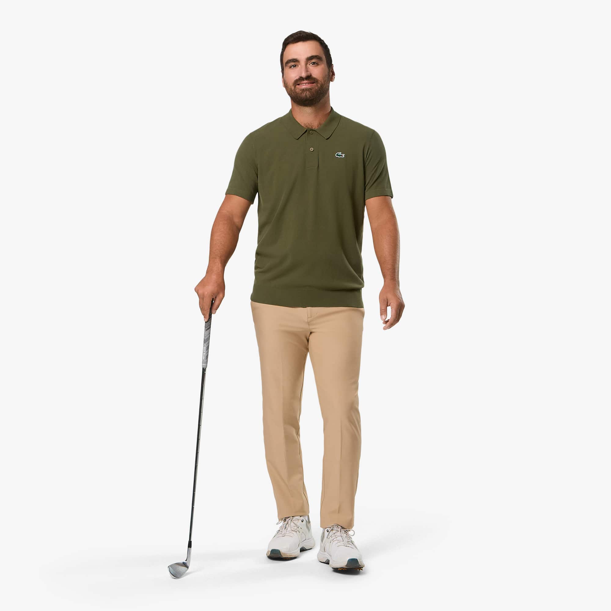 Made from stretch fabric for freedom of movement, with silicone strips inside the waistband to keep your polo shirt in place as you swing.