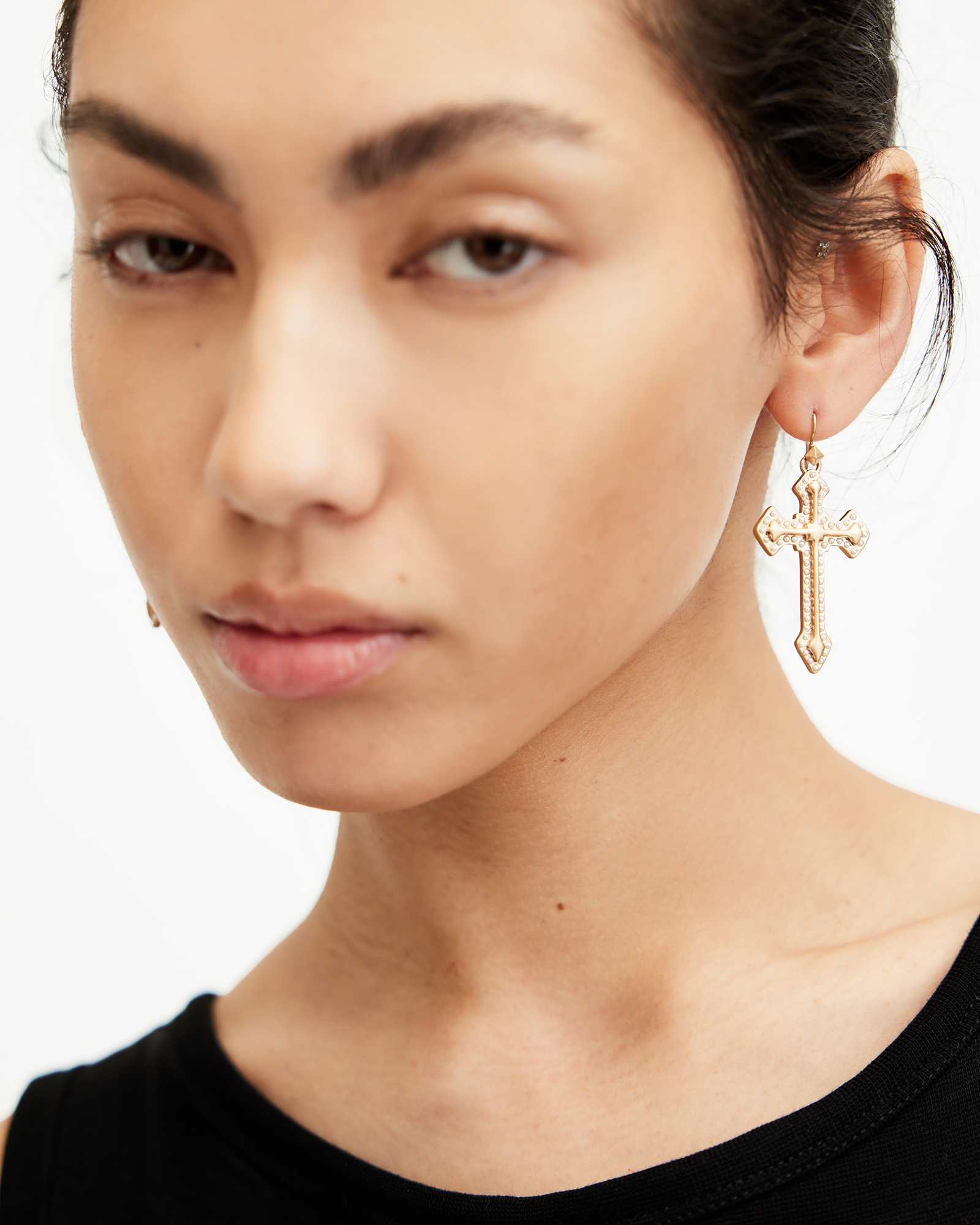 AllSaints Brass Tilley Pearl Cross Pendant Earrings | ricciano IRELAND