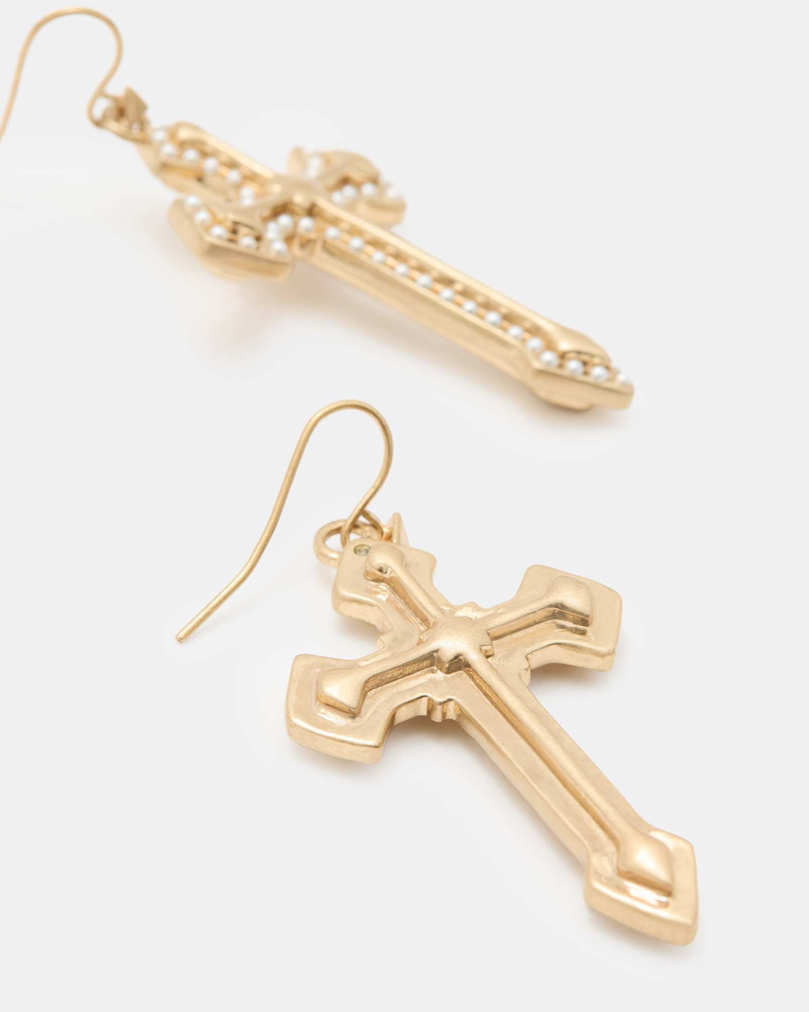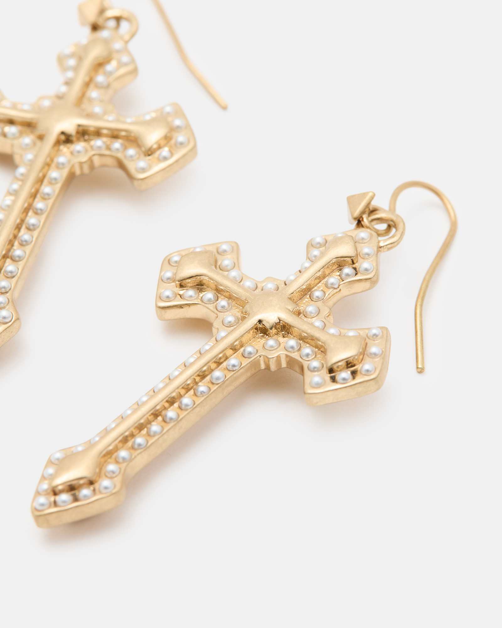 Earrings Fish hook closure Cross hanging pendant Small pearl beaded detail AllSaints engraved signature Gold tone finish