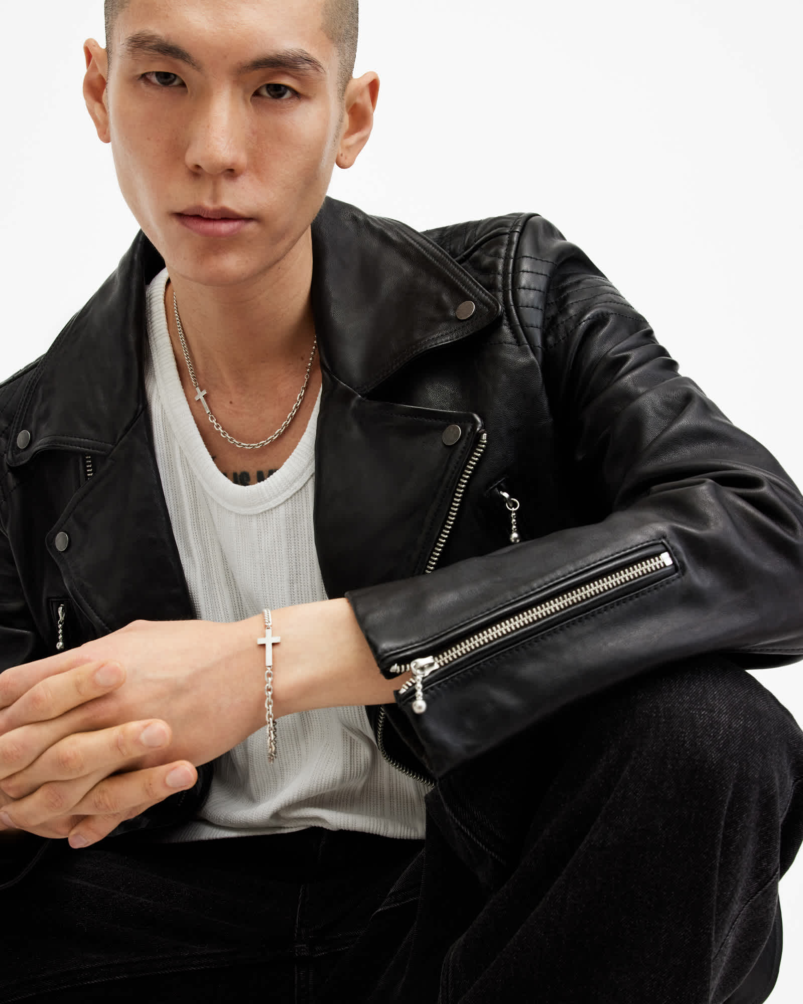 Chain necklace Lobster clasp closure Cross pendant Engraved AllSaints signature Sterling silver