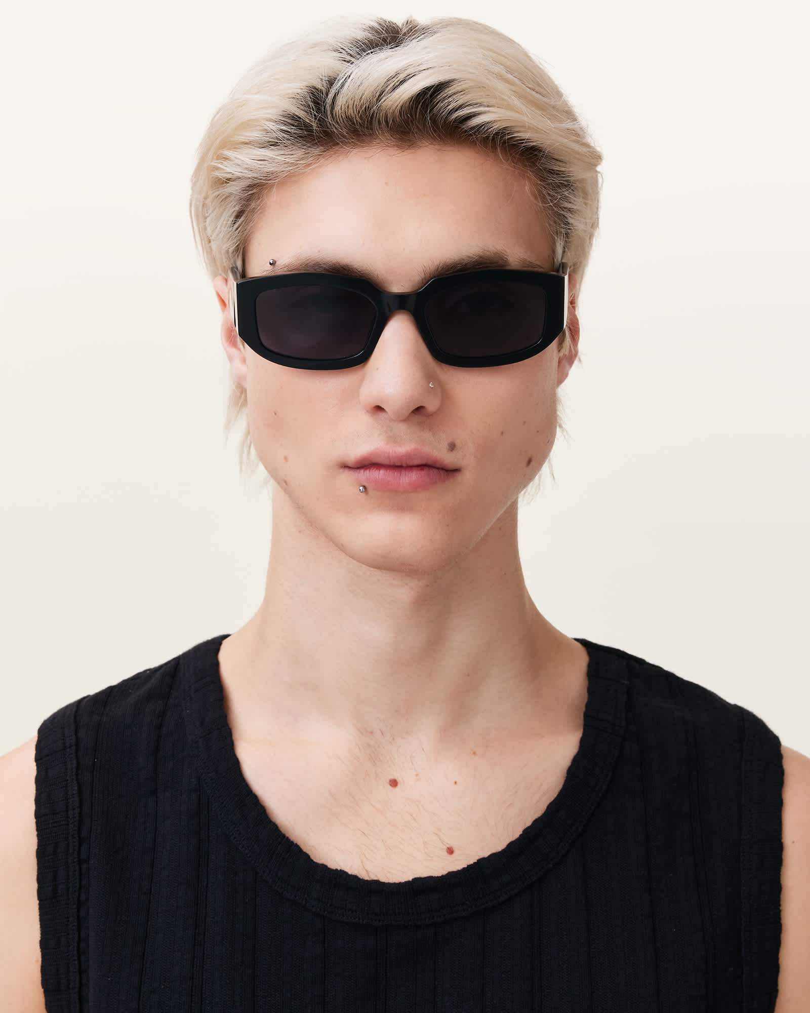 Rectangular frame AllSaints bolt detailing Signature hexagon metal detailing Magnetic fastened case Recycled lens cloth Please note, these sunglasses are not suitable to wear while driving
