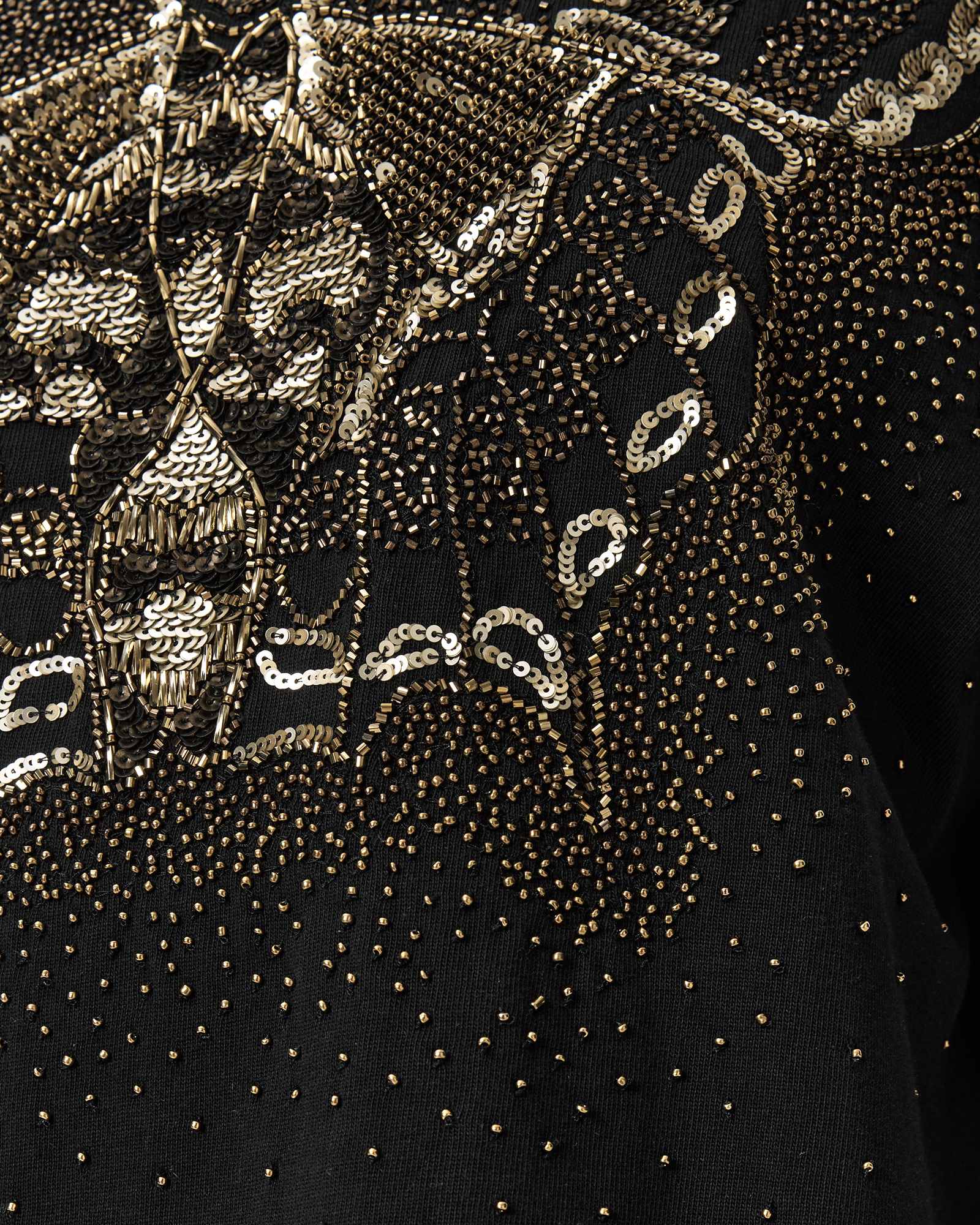 Pull on Crew neck Short sleeves Ribbed trims Embellished with beads and sequins to form a butterfly Model is 5'11" and wearing size Small, Pull on, Crew neck , Short sleeves