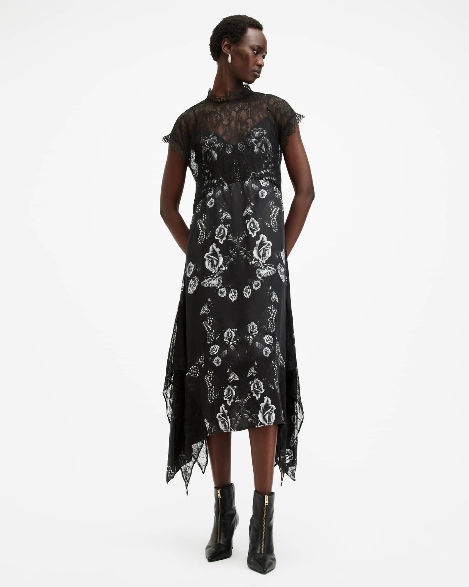 This dress is designed to a regular fit Button closure Crew neck Sleeveless Asymmetric hem Maxi-length Lace shoulder panels Lower side panelling Integrated side pockets Scallop trim Recycled lining