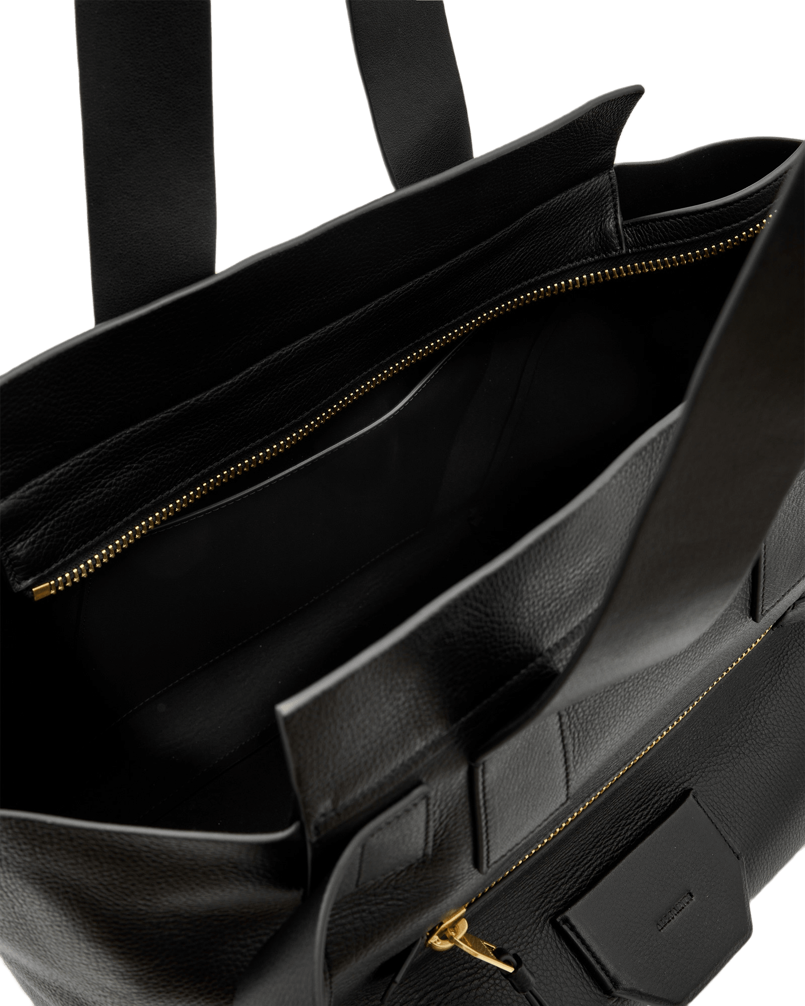 Zip closure Grab strap Modern tote shape shape Smooth leather One internal pocket Metal hardware Will fit most i Phone models - please check measurements