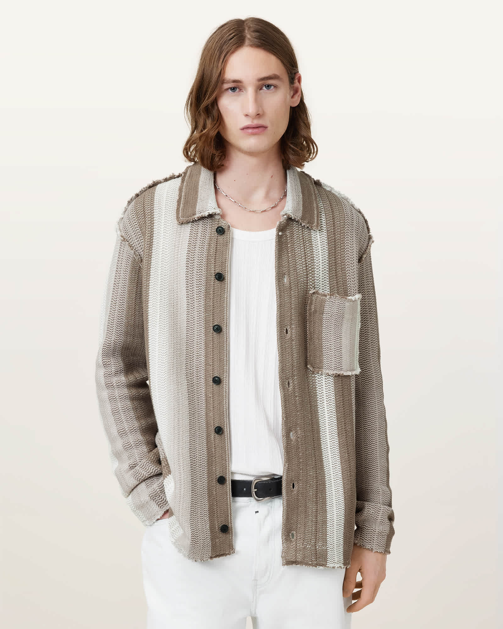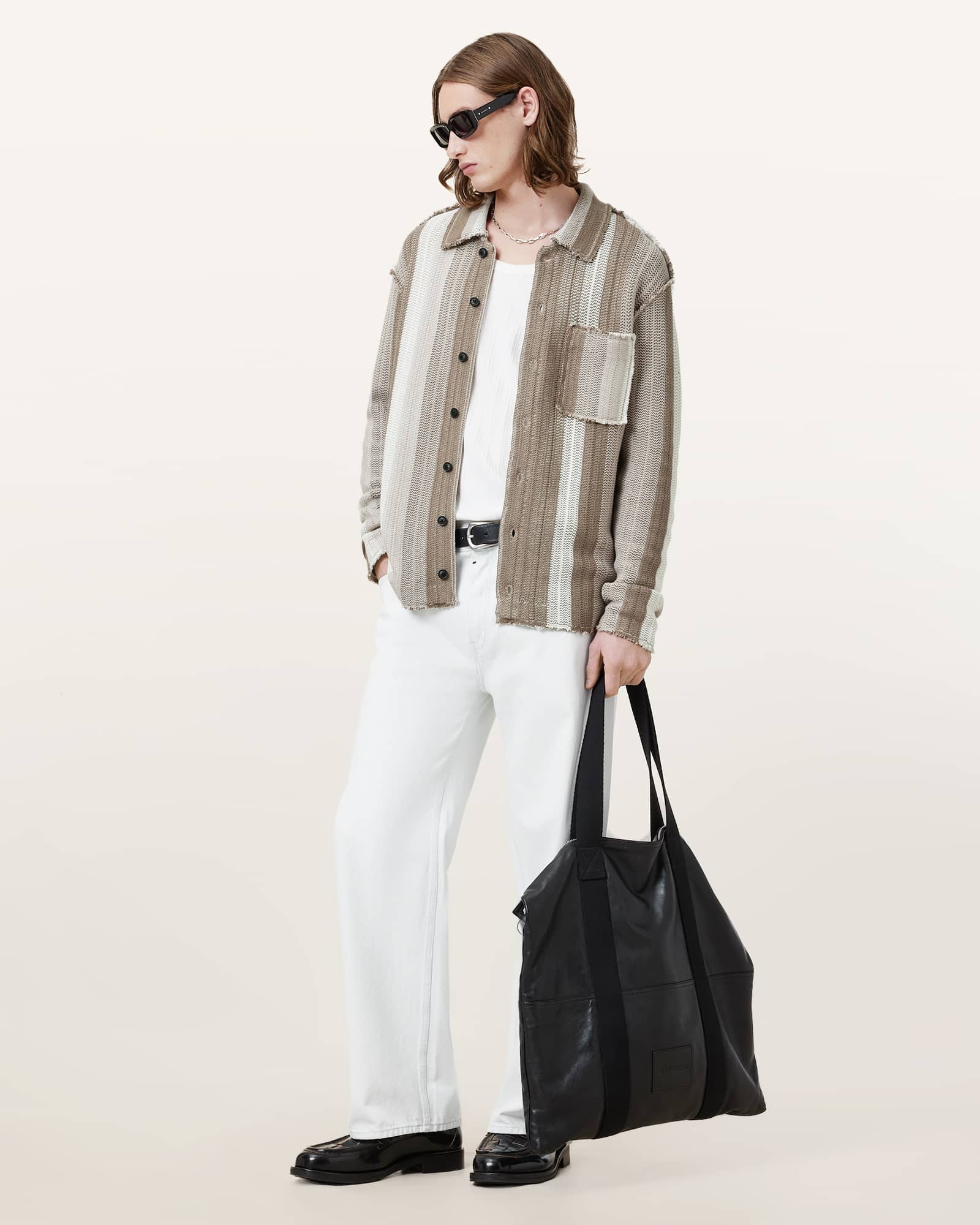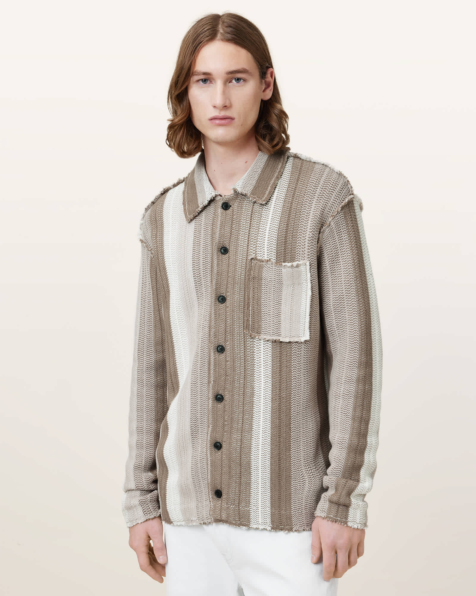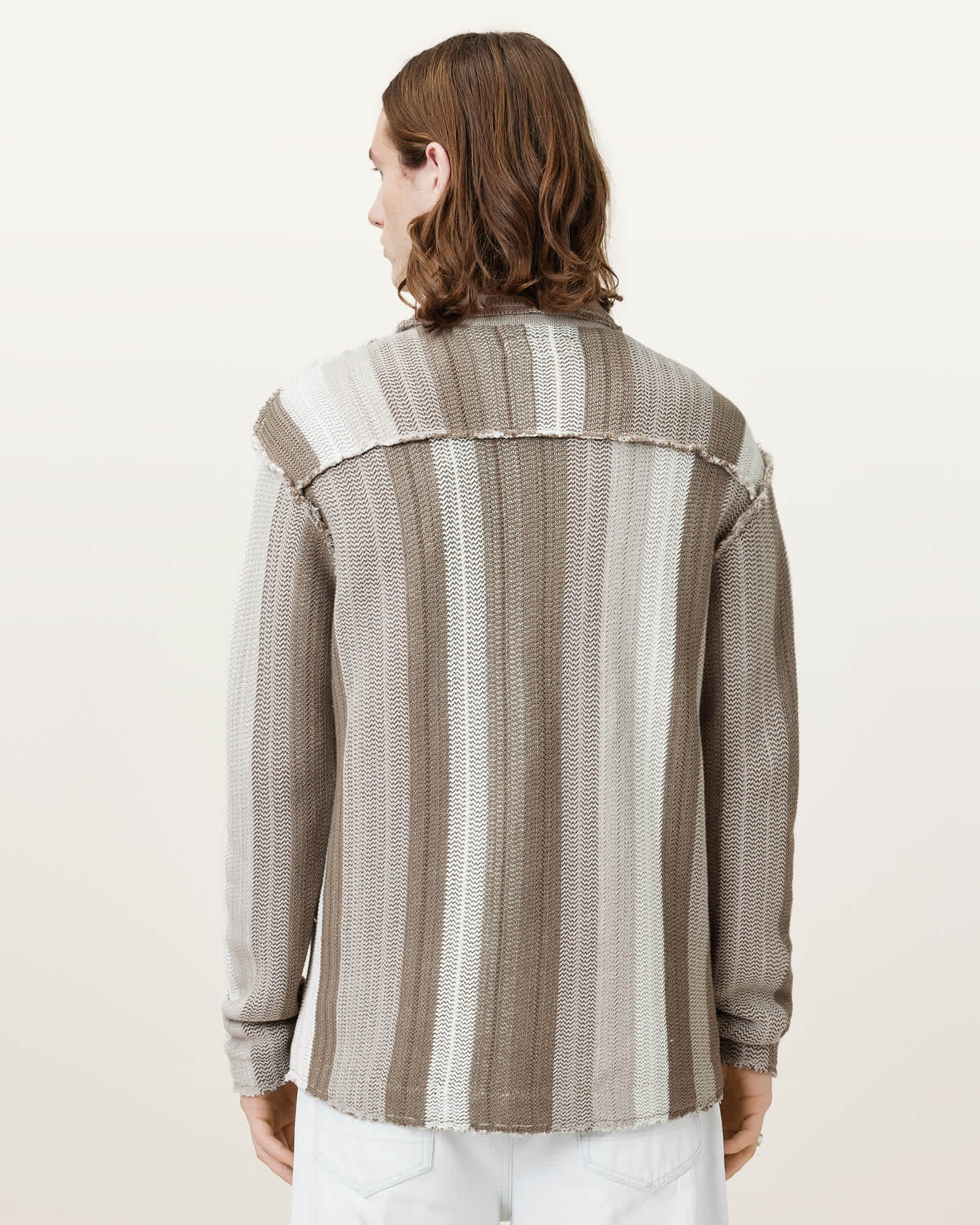 All Saints Exclusives: limited-edition pieces available only in our standalone stores and on allsaints.com This cardigan is designed to a regular fit Long sleeves Button closure Raw edges and frays One patch pocket Textured yarn Striped Trucker silhouette