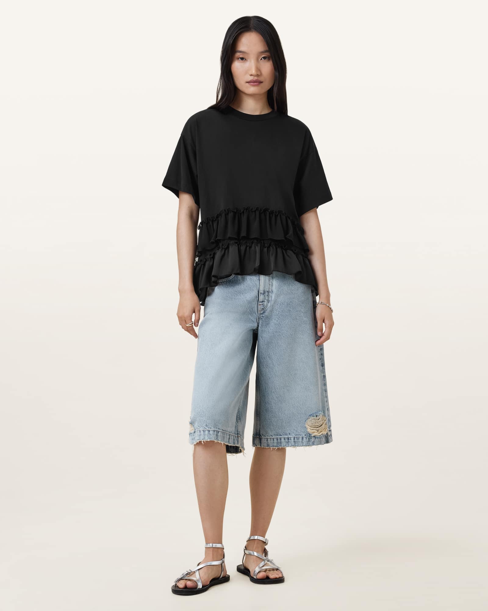 This top is designed to a relaxed fit Pull over Crew neck Frill detailing Slightly dipped hem Lightweight