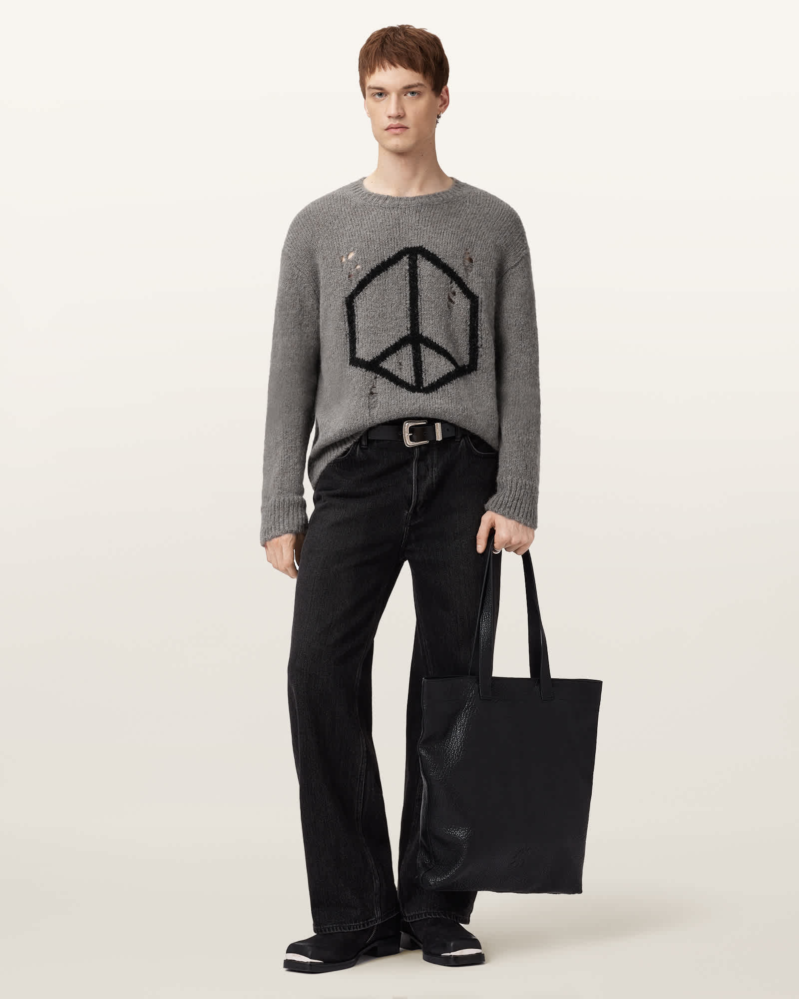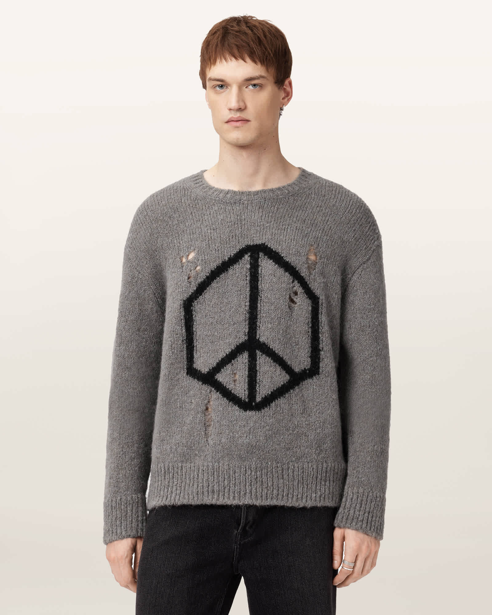 Pull over Crew neck Long sleeves Peace sign intarsia Slight open stitch Distressed and ladder detailing The model is 6'1" and is wearing size Medium