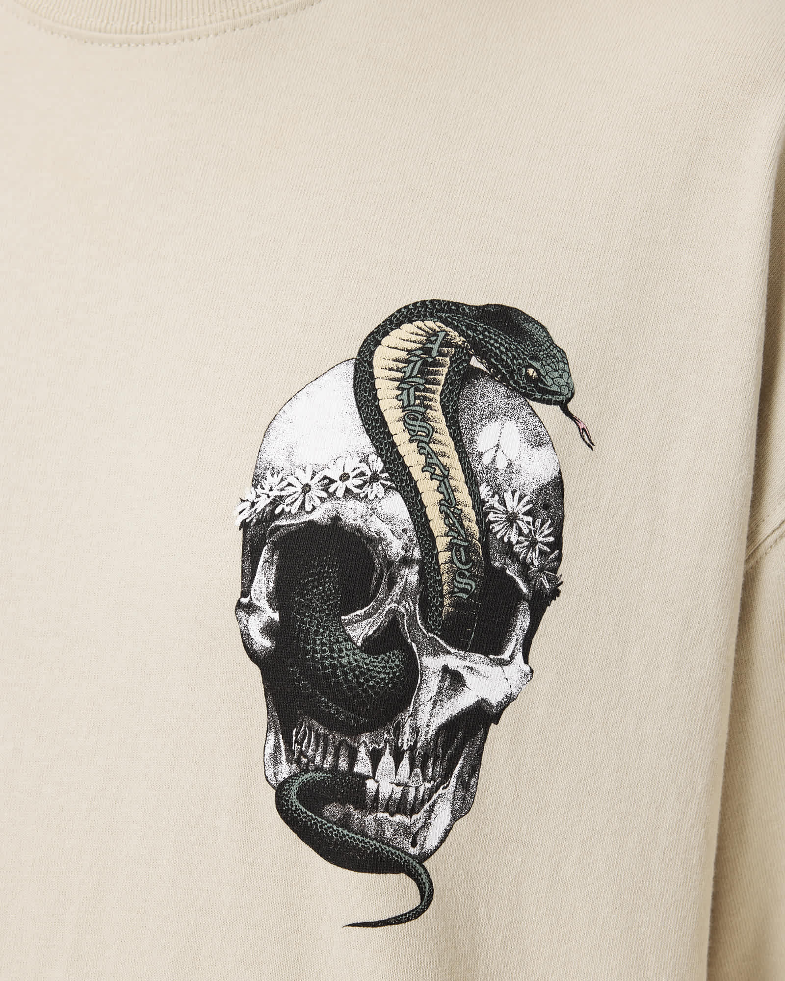 Crew neck Short sleeves Twin needle stitch detailing Snake seasonal artwork with All Saints branding screenprinted Model is 5'8.5" and wearing size Small
