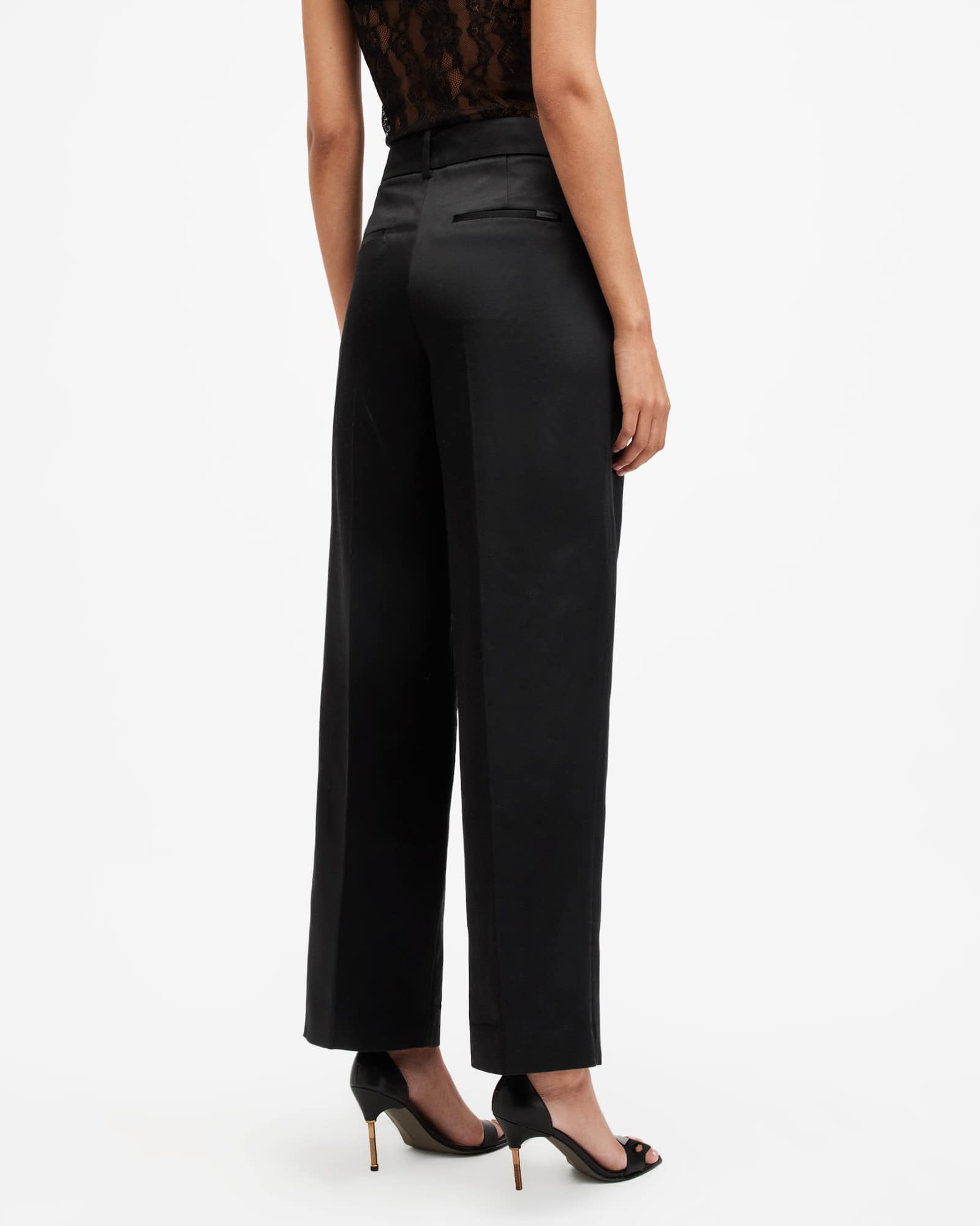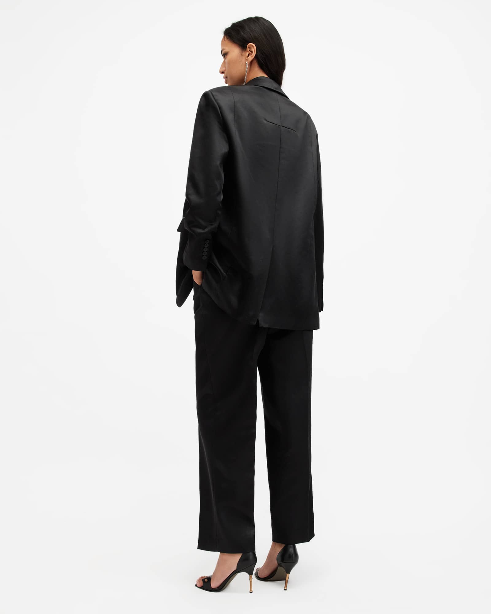 These trousers are designed to a relaxed fit Zip closure Mid-rise fit Wide leg Four pockets Recycled lining Matching blazer Double weight satin woven in Europe by Italian-inspired mill, Miroglio Lana.